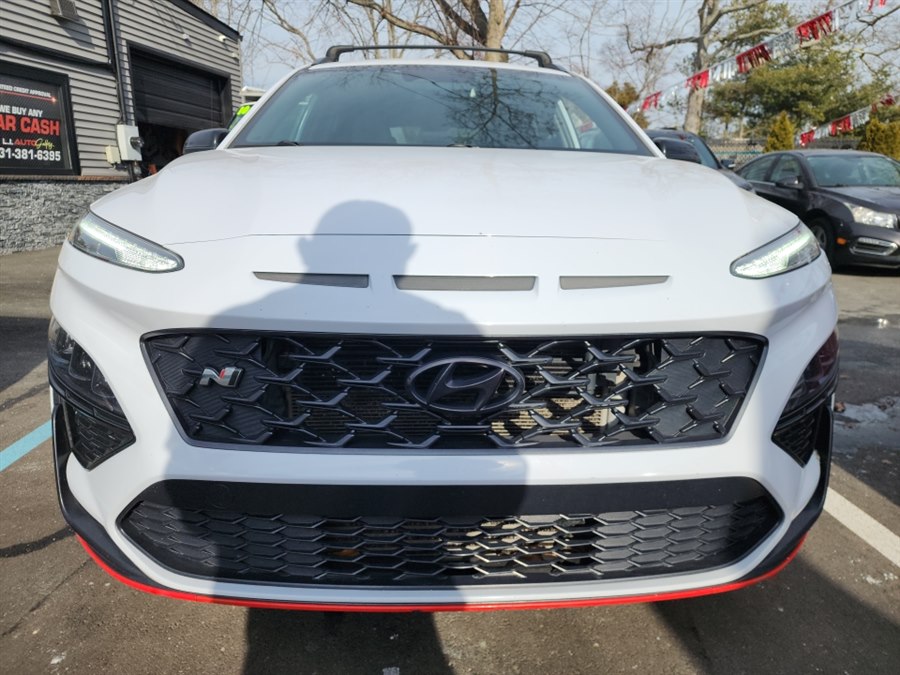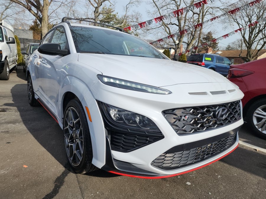 2022 Hyundai Kona N FWD, available for sale in Islip, New York. This vehicle features a 2.4L Turbo-GDI DOHC 16-Valve I4 engine and a N 8-Speed Wet Dual Clutch transmission. The Kona N offers a sporty driving experience with features like a heads-up display, navigation system, and a turbocharged engine. The interior is designed for comfort and style with heated leather seats and a heated steering wheel. This car is in stock and available at L.I. Auto Gallery in Islip, NY.
