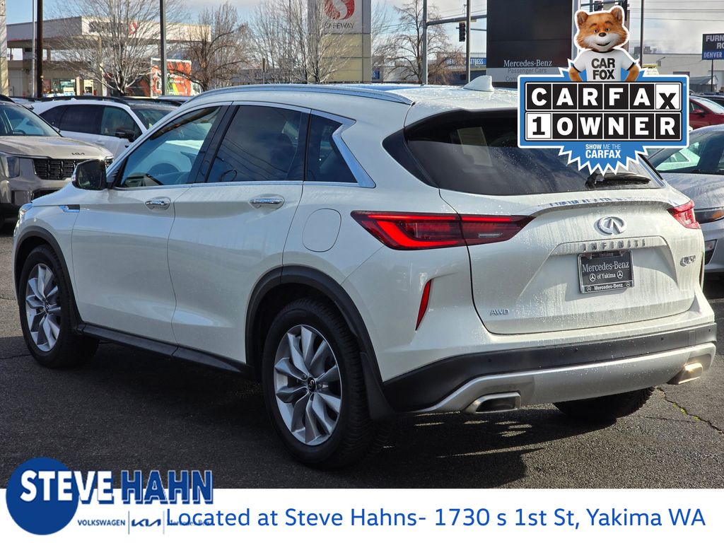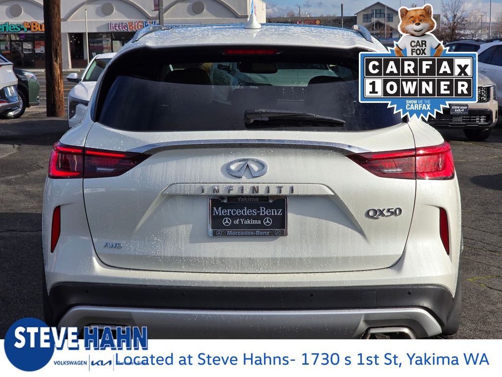 Recent Arrival! CARFAX One-Owner. Majestic White 2022 Infiniti QX50 LUXE I4 CVT AWD 4D Sport Utility 4-Wheel Disc Brakes, 5.846 Axle Ratio, 6 Speakers, ABS brakes, Air Conditioning, Alloy wheels, AM/FM radio: SiriusXM, Anti-whiplash front head restraints, Auto High-beam Headlights, Auto-dimming Rear-View mirror, Automatic temperature control, Black Splash Guards (Set of 4), Brake assist, Bumpers: body-color, Cargo Package, CD player, Delay-off headlights, Driver door bin, Driver vanity mirror, Dual front impact airbags, Dual front side impact airbags, Electronic Stability Control, Emergency communication system: INFINITI InTouch, Exterior Parking Camera Rear, Floor Mats, Four wheel independent suspension, Front anti-roll bar, Front Bucket Seats, Front Center Armrest, Front dual zone A/C, Front fog lights, Front reading lights, Fully automatic headlights, Garage door transmitter: HomeLink, Heated door mirrors, Heated Front Bucket Seats, Heated front seats, Illuminated entry, Illuminated Kick Plates, Knee airbag, Leather Shift Knob, Leather-Appointed Seat Trim, Low tire pressure warning, Occupant sensing airbag, Outside temperature display, Overhead airbag, Overhead console, Panic alarm, Passenger door bin, Passenger vanity mirror, Power door mirrors, Power driver seat, Power Liftgate, Power moonroof, Power passenger seat, Power steering, Power windows, Radio data system, Radio: HD Audio System, Rear anti-roll bar, Rear Parking Sensors, Rear reading lights, Rear seat center armrest, Rear side impact airbag, Rear window defroster, Rear window wiper.