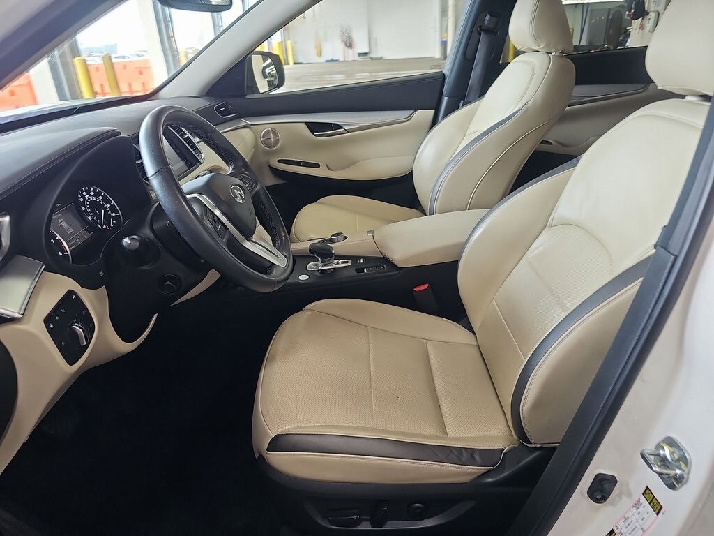 2022 INFINITI QX50 Sensory Recent Arrival! One owner, Bluetooth, fully reconditioned, navigation, alloy wheels, panoramic sunroof, leather. QX50 Sensory, 4D Sport Utility, I4, CVT, AWD, Majestic White, Wheat/Black with Semi-Aniline Leather-Appointed Seat Trim, 16 Speakers, 4-Wheel Disc Brakes, ABS brakes, Adaptive Cruise Control, AM/FM radio: SiriusXM, Anti-whiplash front head restraints, Auto High-beam Headlights, Auto tilt-away steering wheel, Auto-dimming Rear-View mirror, Automatic temperature control, Brake assist, Climate Controlled Front Bucket Seats, Dual front impact airbags, Dual front side impact airbags, Electronic Stability Control, Four wheel independent suspension, Front dual zone A/C, Front fog lights, Fully automatic headlights, Garage door transmitter: HomeLink, Heads-Up Display, Heated door mirrors, Heated front seats, Heated rear seats, Heated steering wheel, Illuminated entry, Illuminated Kick Plates, Knee airbag, Leather Shift Knob, Low tire pressure warning, Memory seat, Navigation system: INFINITI InTouch Navigation, Occupant sensing airbag, Overhead airbag, Panic alarm, Power door mirrors, Power driver seat, Power Liftgate, Power passenger seat, Radio: Bose Performance Series Audio System, Rear reading lights, Rear side impact airbag, Rear window defroster, Remote keyless entry, Security system, Semi-Aniline Leather-Appointed Seat Trim, Speed-sensing steering, Steering wheel memory, Telescoping steering wheel, Traction control, Turn signal indicator mirrors, Ventilated front seats, Wheels: 20" Silver Painted Machine Finished. 22/28 City/Highway MPG.