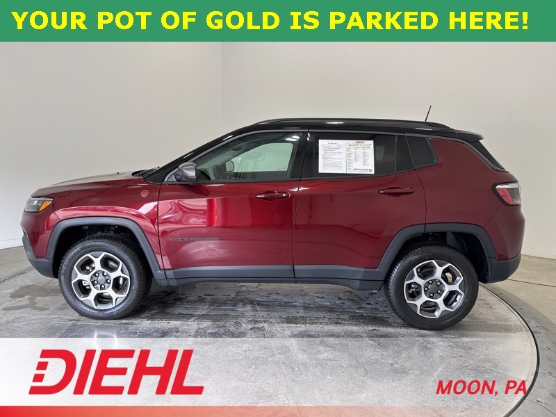 4WD, Front Bucket Seats, Quick Order Package 2GE, Rain sensing wipers. Velvet Red Pearlcoat 2022 Jeep Compass Trailhawk 2.4L I4 9-Speed 948TE Automatic CARFAX One-Owner. Clean CARFAX. Bold color, real trail chops, and everyday comfort come together nicely in this 2022 Jeep Compass Trailhawk, an SUV that looks just as good pulling into the office as it does heading toward the trailhead. Finished in Velvet Red Pearlcoat, it brings some attitude before you even turn the key. Once you're inside, the Trailhawk cabin keeps things practical and comfortable with leather and cloth bucket seats, a leather wrapped steering wheel, dual zone climate control, and an auto dimming rearview mirror. The premium sound system, Bluetooth connectivity, satellite radio, and front seatback storage make daily driving easy, while the backup camera and blind spot monitoring help take the stress out of tight parking lots and busy highways. Under the hood, the 2.4L engine is paired with a 9 speed automatic transmission and Jeeps Trail Rated capability. Part and full time four wheel drive, Selec Terrain drive modes, skid plates, off road suspension, tow hooks, and hill friendly traction control give this Compass Trailhawk the confidence to handle rough weather, gravel roads, or spontaneous weekend adventures. Adaptive cruise control, lane departure warning with lane keeping assist, forward collision mitigation, and cross traffic alert round out a strong safety suite.