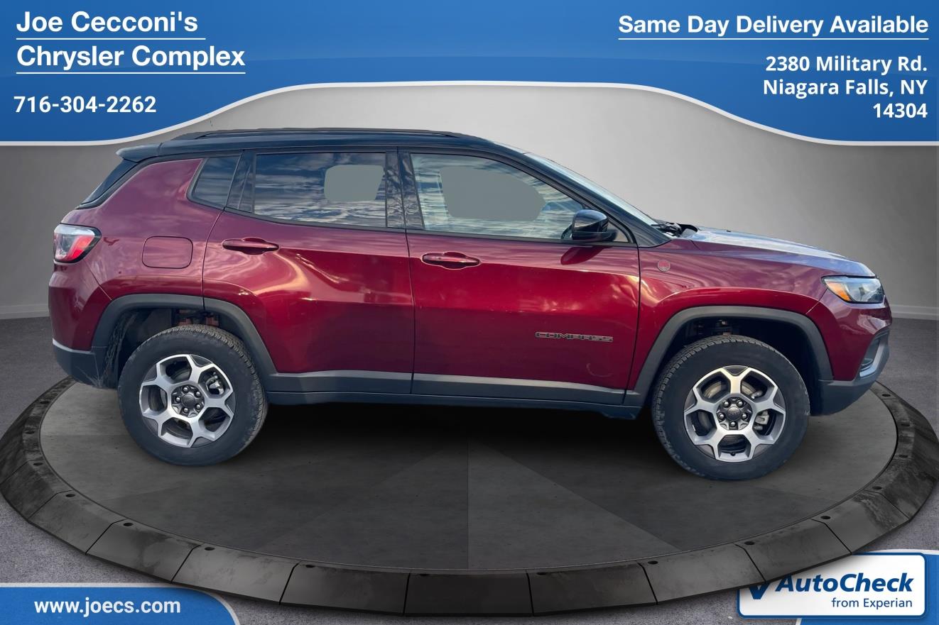 Velvet Red Pearlcoat 2022 Jeep Compass Trailhawk with 11,281 miles has the style and comfort to fit your lifestyle! No Accidents! One Owner! Ask for an Auto Check vehicle history report on any of our used vehicles in inventory. All of our used vehicles are thoroughly reconditioned, with new brakes and tires standard on any worn past 50% of their expected life. Niagara Hyundai is dedicated to your satisfaction before, during, and after your purchase. We'll go the extra mile to take care of you.