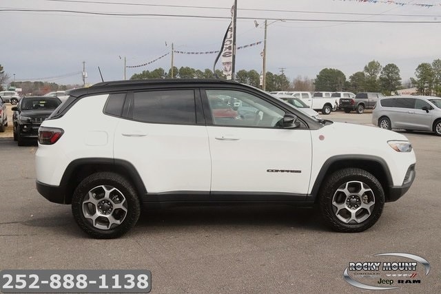 CARFAX One-Owner. Clean CARFAX. Bright White Clearcoat 2022 Jeep Compass Trailhawk 4WD 9-Speed 948TE Automatic 2.4L I4 4WD. Recent Arrival! 22/30 City/Highway MPG At Rocky Mount Chrysler Dodge Jeep Ram, you can trust in the quality of our expansive selection of Used Cars, call today for a test drive! Special financing rates available. Price indicated assumes eligibility - inclusion of $1000 internet discount - $1000 trade in assistance and $500.00 Chrysler credit financing - reductions indicated in price, plus tax, tag, dealer installed equipment and $679 closing fee. Rocky Mount Chrysler Dodge Jeep Ram FIAT is dedicated to your satisfaction before, during, and after your purchase. We'll go the extra mile to take care of you.