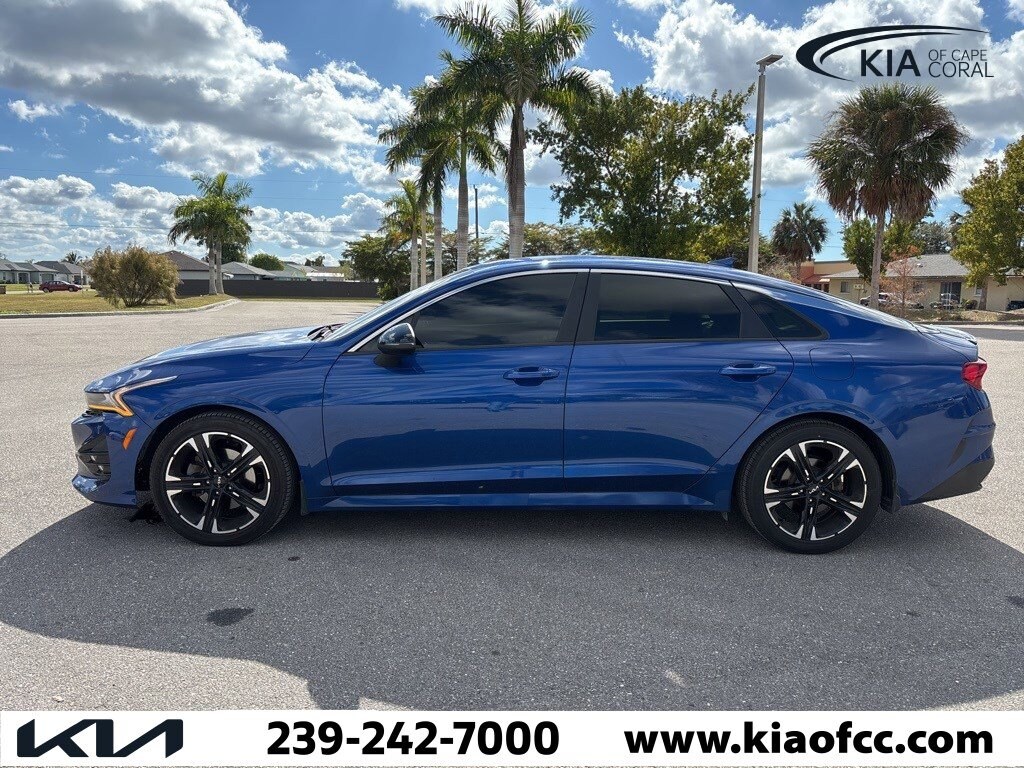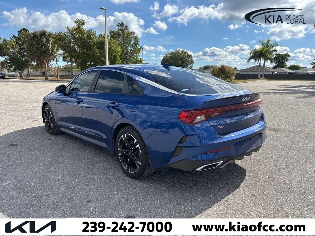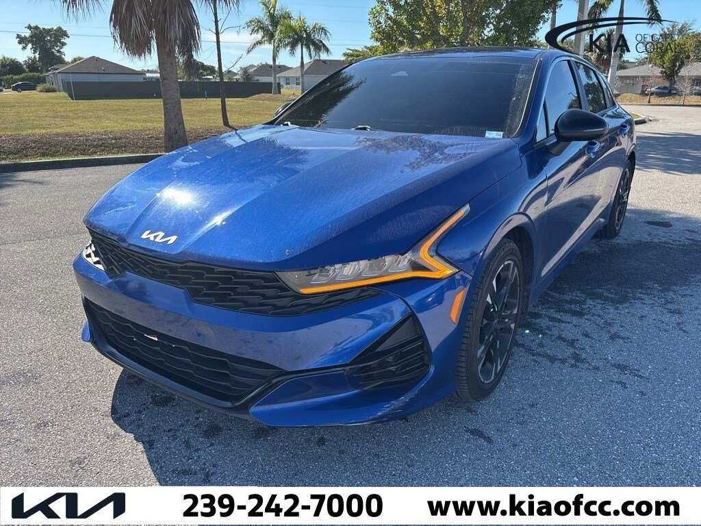 K5 GT-Line, 4D Sedan, I4, 8-Speed Automatic, AWD, Sapphire Blue, Black Cloth. 2022 Kia K5 GT-Line Sapphire Blue K5 GT-Line AWD I4 8-Speed Automatic. CALL THE ALL-NEW Kia of Cape Coral today at (239) 242-7000 to check availability and schedule a test drive! We are located at 404 NE Pine Island Rd, Cape Coral FL 33909. While we strive for accuracy, dealer is not responsible for errors in standard equipment or options listed. All prices include dealer assisted financing, see dealer for details.