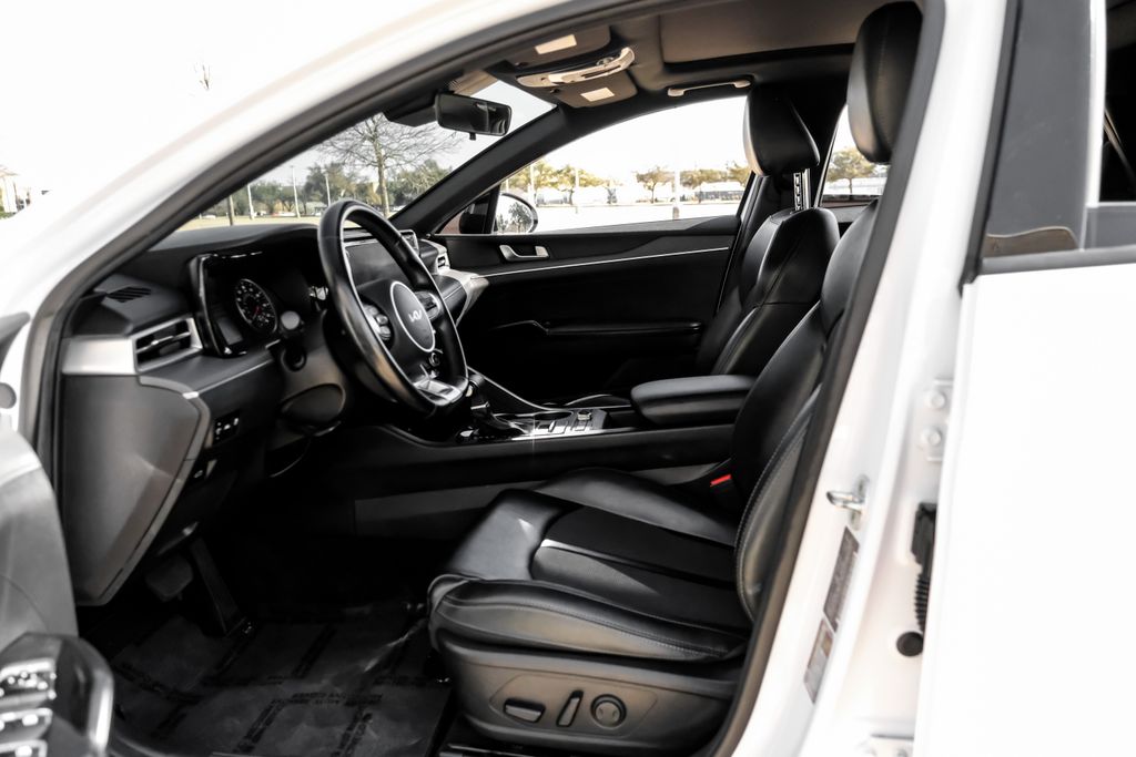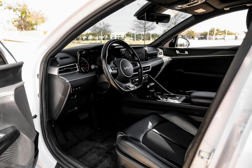 Glacial White Pearl 2022 Kia K5 GT-Line FWD 8-Speed Automatic I4 Forward Collision Avoidance-Assist - Cyclist, Forward Collision Avoidance-Assist - Junction Turn, Gloss Black Pillar & Door Frame Cover, GT-Line FWD Premium Package, Highway Driving Assist, LED Interior Lighting, LED Projection Headlights, Navigation-Based Smart Cruise Control - Curve, Panoramic Sunroof, Smart Cruise Control w/Stop & Go. GT-Line FWD Premium Package (Forward Collision Avoidance-Assist - Cyclist, Forward Collision Avoidance-Assist - Junction Turn, Gloss Black Pillar & Door Frame Cover, Highway Driving Assist, LED Interior Lighting, LED Projection Headlights, Navigation-Based Smart Cruise Control - Curve, Panoramic Sunroof, and Smart Cruise Control w/Stop & Go), 4-Wheel Disc Brakes, 6 Speakers, ABS brakes, Air Conditioning, Alloy wheels, AM/FM radio: SiriusXM, Apple CarPlay & Android Auto, Auto High-beam Headlights, Automatic temperature control, Brake assist, Bumpers: body-color, Cargo Mat, Cargo Tray, Carpeted Floor Mats, Cloth/Leatherette Seat Trim, Delay-off headlights, Driver door bin, Driver vanity mirror, Dual front impact airbags, Dual front side impact airbags, Electronic Stability Control, Four wheel independent suspension, Front anti-roll bar, Front Bucket Seats, Front Center Armrest, Front dual zone A/C, Front fog lights, Front reading lights, Fully automatic headlights, Heated door mirrors, Illuminated Door Sill Plates, Illuminated entry, Knee airbag, LED Trunk Light, Low tire pressure warning, Navigation System, Occupant sensing airbag, Outside temperature display, Overhead airbag, Overhead console, Panic alarm, Passenger door bin, Passenger vanity mirror, Power door mirrors, Power driver seat, Power steering, Power windows, Radio data system, Radio: AM/FM/MP3 Audio System, Rear anti-roll bar, Rear seat center armrest, Rear side impact airbag, Rear window defroster, Remote keyless entry, Security system, Speed control, Speed-sensing steering, Split folding rear seat, Spoiler, Sport steering wheel, Steering wheel mounted audio controls, Tachometer, Telescoping steering wheel, Tilt steering wheel, Traction control, Trip computer, Turn signal indicator mirrors, Variably intermittent wipers, Wheel Locks, and Wheels: 7.5J x 18" Gloss Black Machined Finish Alloy. Recent Arrival! 27/37 City/Highway MPG