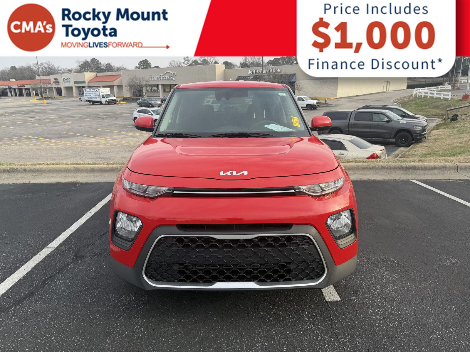 Thank you for choosing CMA's Rocky Mount Toyota, this Inferno Red 2022 Kia Soul is a great choice! Check out the following: No Accidents! One Owner! City 0/ Hwy 0. Pricing includes $1,000 dealer financing discount. Customer must finance with dealer through in house finance partners, or add back the $1,000 for any outside liens or cash purchases. Pricing excludes tax, tags, doc fee, and dealer added accessories. All vehicles are sold on a first come first serve basis due to multiple people interested in the same vehicles without prior knowledge. Pricing Info Good Today Through Close of Business. Pricing includes $1,000 dealer financing discount. Customer must finance with dealer through in house finance partners, or add back the $1,000 for any outside liens or cash purchases. Pricing excludes tax, tags, doc fee, and dealer added accessories. All vehicles are sold on a first come first serve basis due to multiple people interested in the same vehicles without prior knowledge. Pricing Info Good Today Through Close of Business. At Rocky Mount Toyota we believe in LIVE MARKET PRICING on all vehicles in our inventory. We use real-time market price comparisons to constantly adjust prices to provide all buyers the best value price possible. Pricing Info Good Today Through Close of Business. We utilize state-of-the-art technology to constantly monitor pricing trends in order to offer our shoppers our best competitive pricing and value. Our entire team is committed to helping you buy a car the way we would want to buy a car!