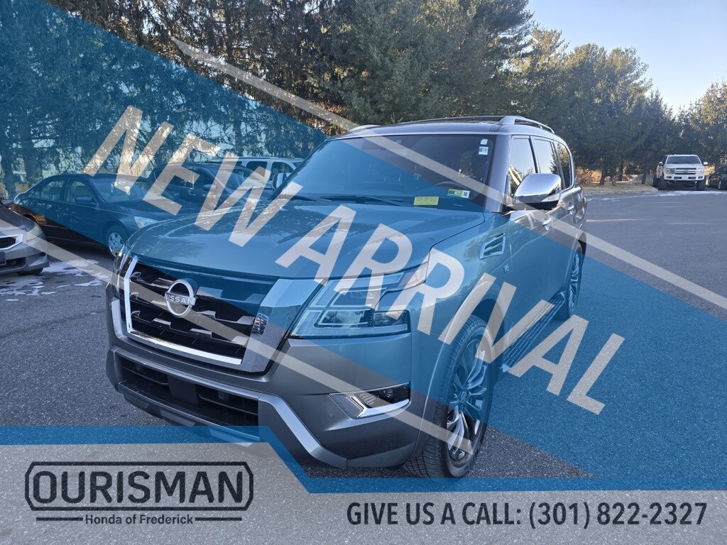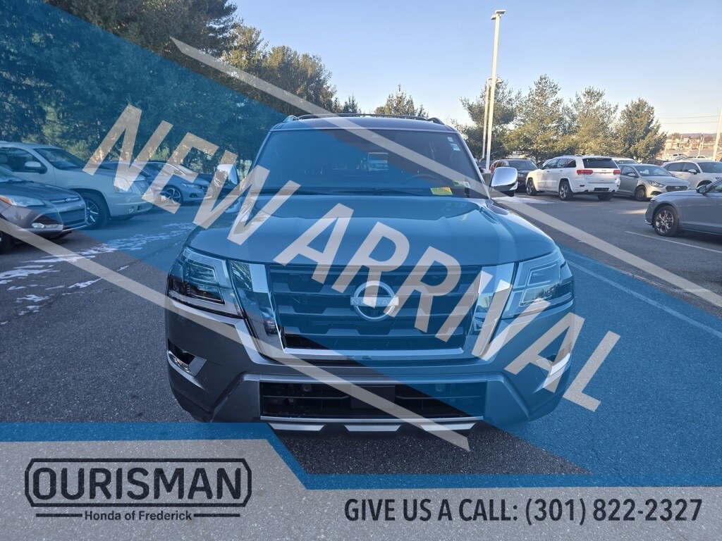 Ourisman Honda of Frederick is proud to present the 2022 Nissan Armada Platinum. The 2022 Nissan Armada Platinum delivers commanding presence, robust performance, and upscale comfort in a full-size SUV that feels as capable on long family road trips as it does cruising around town. The exterior makes a bold statement with a massive front grille, LED headlights and taillights, chrome accents, 22-inch alloy wheels, and refined body lines that project confidence and luxury. Underneath its powered by a 5.6-liter Endurance V8 engine paired with a 7-speed automatic transmission, offering strong, smooth power and plenty of torque for towing, merging, and effortless highway driving. The Platinum trim elevates the interior with premium leather seating, heated and ventilated front seats, a power-adjustable driver's seat with memory settings, and a spacious three-row layout that easily accommodates adults and kids alike. If you're in the market for a full-size SUV that blends strong V8 performance, premium comfort and modern tech with genuine family-ready versatility.