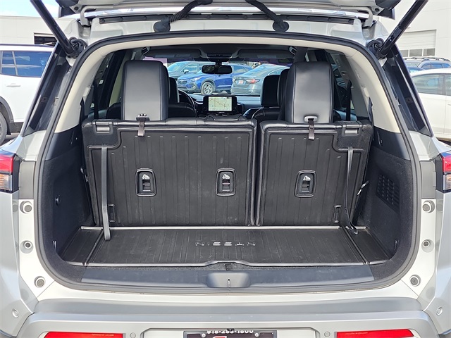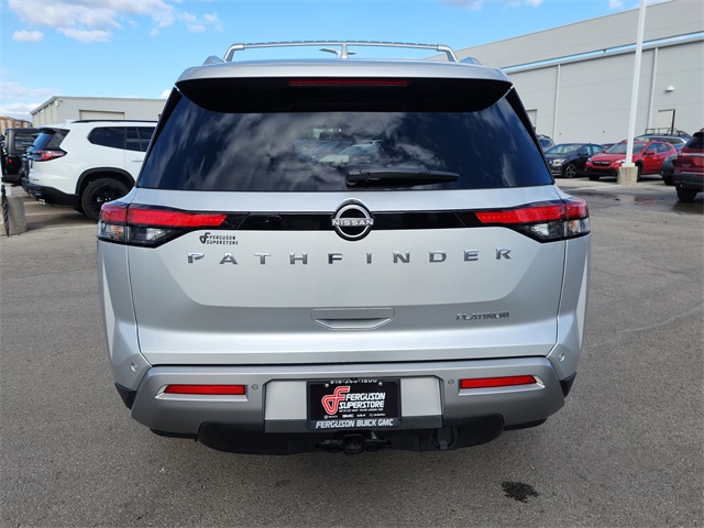 Boldly redesigned and loaded with premium features, this 2022 Nissan Pathfinder Platinum FWD delivers three-row versatility with upscale comfort and cutting-edge tech. Powered by a refined V6 engine paired with a smooth 9-speed automatic transmission, this SUV provides confident performance and efficient highway cruising in a sleek front-wheel drive configuration. Finished in elegant Brilliant Silver Metallic with a sophisticated Charcoal leather interior, the Platinum trim comes fully equipped with heated and ventilated front seats, 12.3-inch digital gauge display, head-up display, power panoramic moonroof, wireless Apple CarPlay/Android Auto, navigation, Bose premium audio, and hands-free power liftgate. With only 49,587 miles, this Pathfinder Platinum is a top-tier family SUV—now available at Ferguson Superstore.