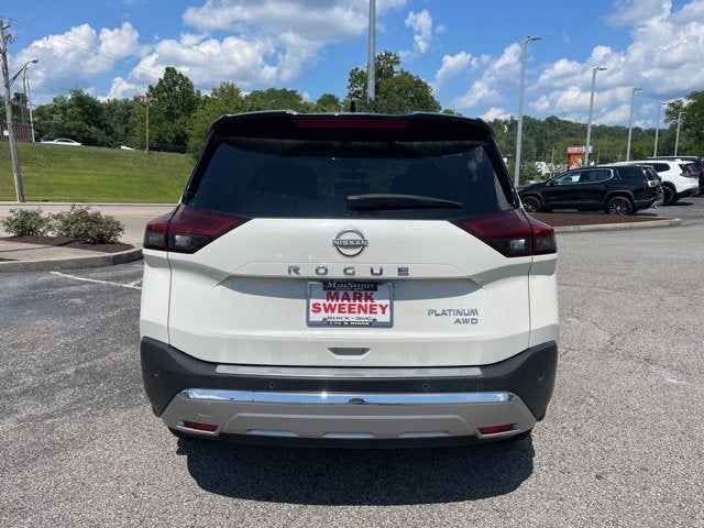 2022 Nissan Rogue Platinum CARFAX One-Owner. AWD, 10 Speakers, 19 Aluminum Alloy Wheels, 4-Wheel Disc Brakes, 5.604 Axle Ratio, ABS brakes, Air Conditioning, Alloy wheels, AM/FM radio: SiriusXM, Apple CarPlay/Android Auto, Auto High-beam Headlights, Auto-dimming Rear-View mirror, Automatic temperature control, Black Splash Guards (Set of 4), Bose Premium Audio System, Brake assist, Bumpers: body-color, Chrome Rear Bumper Protector, Delay-off headlights, Driver door bin, Driver vanity mirror, Dual front impact airbags, Dual front side impact airbags, Electronic Stability Control, Emergency communication system: NissanConnect Services, External Ground Lighting, First Aid Kit, Floor Mats w/2-Piece Cargo Area Protector, Four wheel independent suspension, Frameless Rearview Mirror w/Universal Remote, Front anti-roll bar, Front Bucket Seats, Front Center Armrest, Front dual zone A/C, Front fog lights, Front reading lights, Fully automatic headlights, Head-Up Display Package, Heads-Up Display, Heated door mirrors, Heated Front Bucket Seats, Heated front seats, Heated rear seats, Heated steering wheel, Illuminated entry, Illuminated Kick Plates, Interior Accent Lighting, Knee airbag, Low tire pressure warning, Memory seat, Navigation system: NissanConnect Navigation, Occupant sensing airbag, Outside temperature display, Overhead airbag, Overhead console, Panic alarm, Passenger door bin, Passenger vanity mirror, Power door mirrors, Power driver seat, Power Liftgate, Power moonroof, Power passenger seat, Power steering, Power windows, Quilted Semi-Aniline Leather Seat Trim, Radio data system, Radio: AM/FM NissanConnect w/Navigation, Rear air conditioning, Rear anti-roll bar, Rear reading lights, Rear seat center armrest, Rear side impact airbag, Rear window defroster, Rear window wiper, Remote keyless entry, Retractable Cargo Cover, Roof rack: rails only, Security system, Speed control, Speed-Sensitive Wipers, Split folding rear seat, Spoiler, Steering wheel mounted audio controls, Tachometer, Telescoping steering wheel, Tilt steering wheel, Traction control, Trip computer, Turn signal indicator mirrors, Variably intermittent wipers.