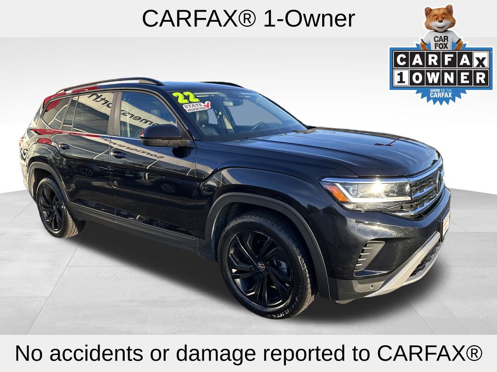 Clean Carfax. Carfax One-Owner. 2022 Volkswagen Atlas Black Fresh Oil Change, new wiper blades, new rear wiper blade, mount & balance 4 tires, perform alignment, 3rd row seats: split-bench, alloy wheels, automatic temperature control, exterior parking camera rear, front dual zone A/C, heated front seats, perforated V-Tex leatherette seating surfaces, rear air conditioning. 2.0L TSI AWD 8-Speed Automatic with Tiptronic. Vehicle pricing includes all offers and incentives. Pricing shown is based on financing through Nissan Motor Acceptance Cooperation, tax, title and tags not included in vehicle prices shown and must be paid by the purchaser.