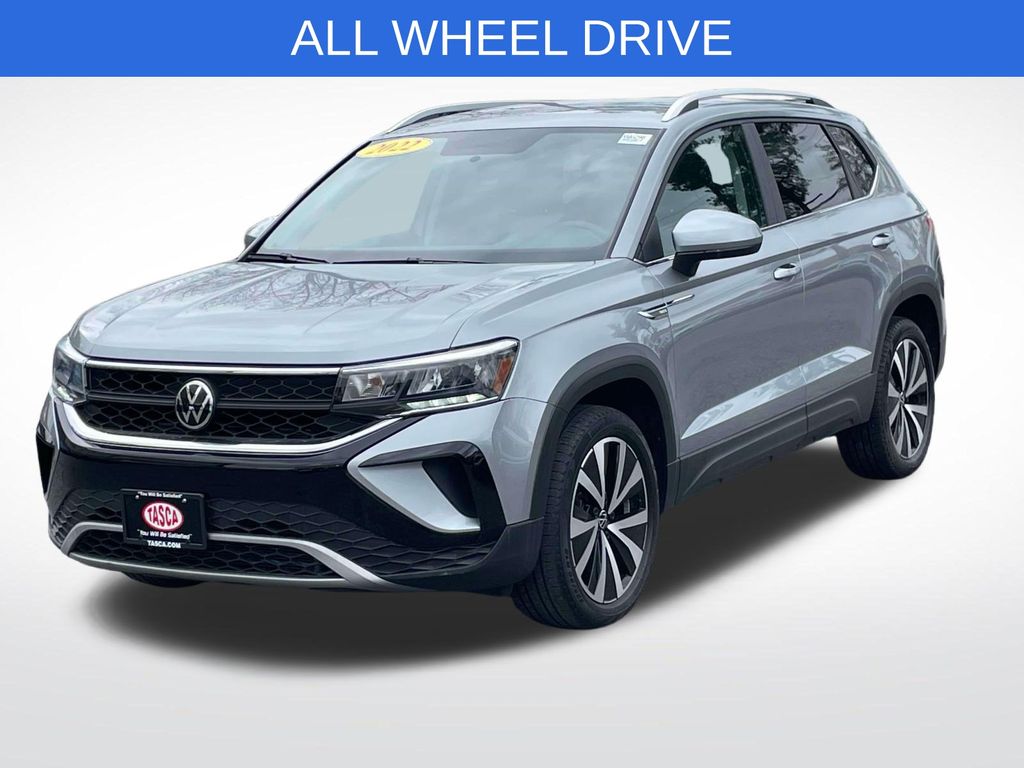 Pyrite Silver Metallic 2022 Volkswagen Taos 1.5T SE 1.5T SE AWD 7-Speed DSG Automatic with Tiptronic 1.5L I4 Turbocharged DOHC 16V LEV3-SULEV30 158hp one owner, all wheel drive, Blind Spot Monitor, Brake assist, Electronic Stability Control, Exterior Parking Camera Rear, Fully automatic headlights, Heated Front Comfort Seats, Heated front seats, Panic alarm, Power driver seat, Radio: MIB3 Composition Media AM/FM/HD, Security system, VW Care, Wheels: 18" 2-Tone Machined Alloy. 25/32 City/Highway MPG CARFAX One-Owner. Odometer is 16642 miles below market average! Buy with confidence from Tasca Automotive Group. Backed by a family-owned legacy of exceptional service and large dealer network, we’re committed to delivering a premium experience every step of the way. You will be satisfied!