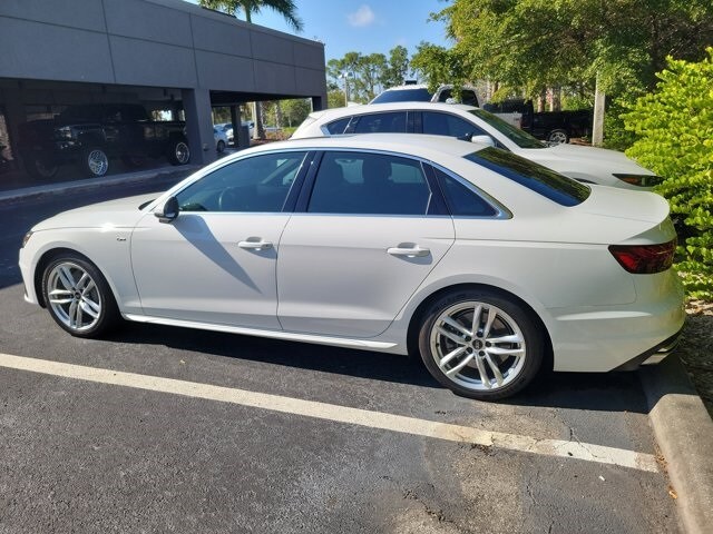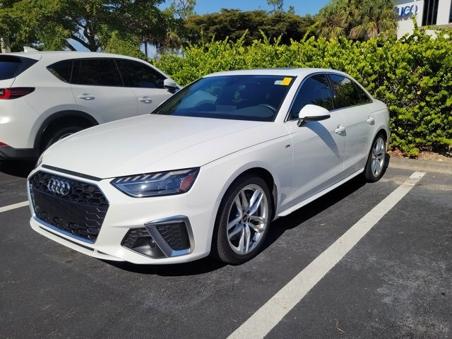 New Price! Glacier White 2023 Audi A4 45 S line Premium quattro quattro 7-Speed Automatic S tronic 2.0L TFSI 7-Speed Automatic S tronic, quattro, Black Leather. All of our pre-owned vehicles go through a rigorous inspection inside and out. We make sure all of our vehicles have good tires, safe brakes and have been though our reconditioning process. We hand pick each vehicle that we sell to provide high quality vehicles at affordable prices! Odometer is 5450 miles below market average! 24/32 City/Highway MPG. There is a reason we have been rated as the consumers top pick dealership to do business with. All of our customers receive a first class, no pressure buying experience. Come see us at Audi of Ft. Myers. We promise it will be worth the visit!