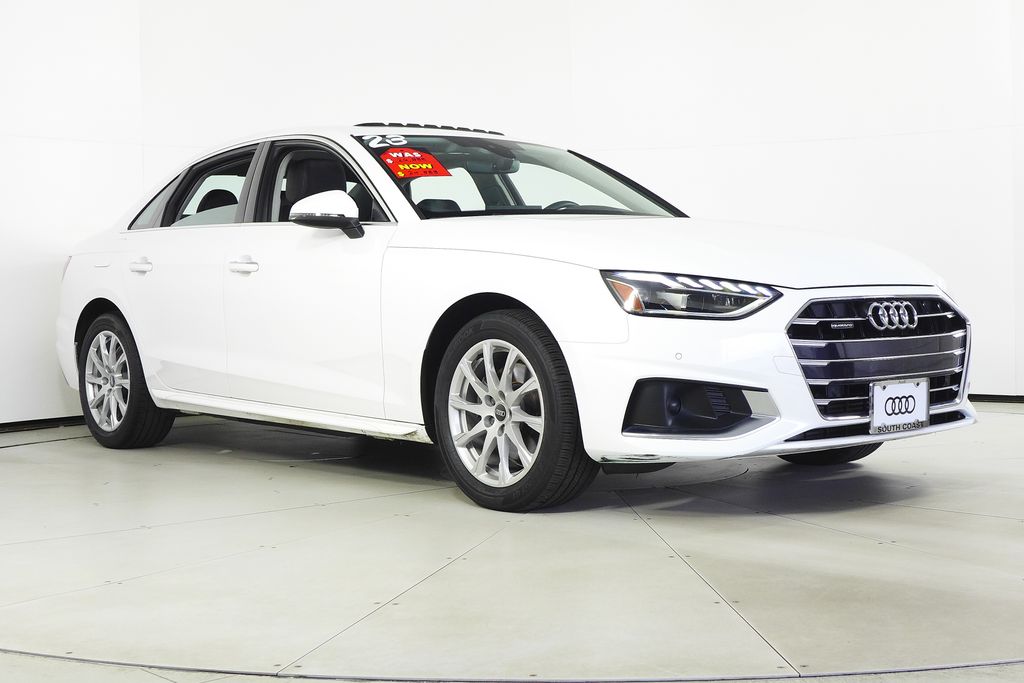 2023 Audi A4 40 Premium quattro. 7-Speed Automatic S tronic, quattro, Black Leather, Adaptive Cruise Control, Alarm System w/Motion Sensor, Audi Advanced Key, Audi Side Assist w/Pre Sense Rear, Auto-Dimming Exterior Mirrors w/Memory, Convenience Package, Heated Steering Wheel, Memory for Driver's Seat, Parking System Plus, SiriusXM w/360L. Complete CARFAX vehicle history report is available. Come take the best test drive route in California at Audi South Coast. Just a quick drive on the 5 freeway from Los Angeles or San Diego counties - Audi South Coast is located at the heart of Orange County in the Santa Ana Auto Mall, next to John Wayne Airport. Due to ongoing parts shortage issues impacting global production, the availability of some equipment, options or features may be limited. Please contact your local Audi Dealer for more information, and be sure to verify the vehicle you purchase includes all expected features and equipment. Thank you for your patience as we work to navigate these limitations.