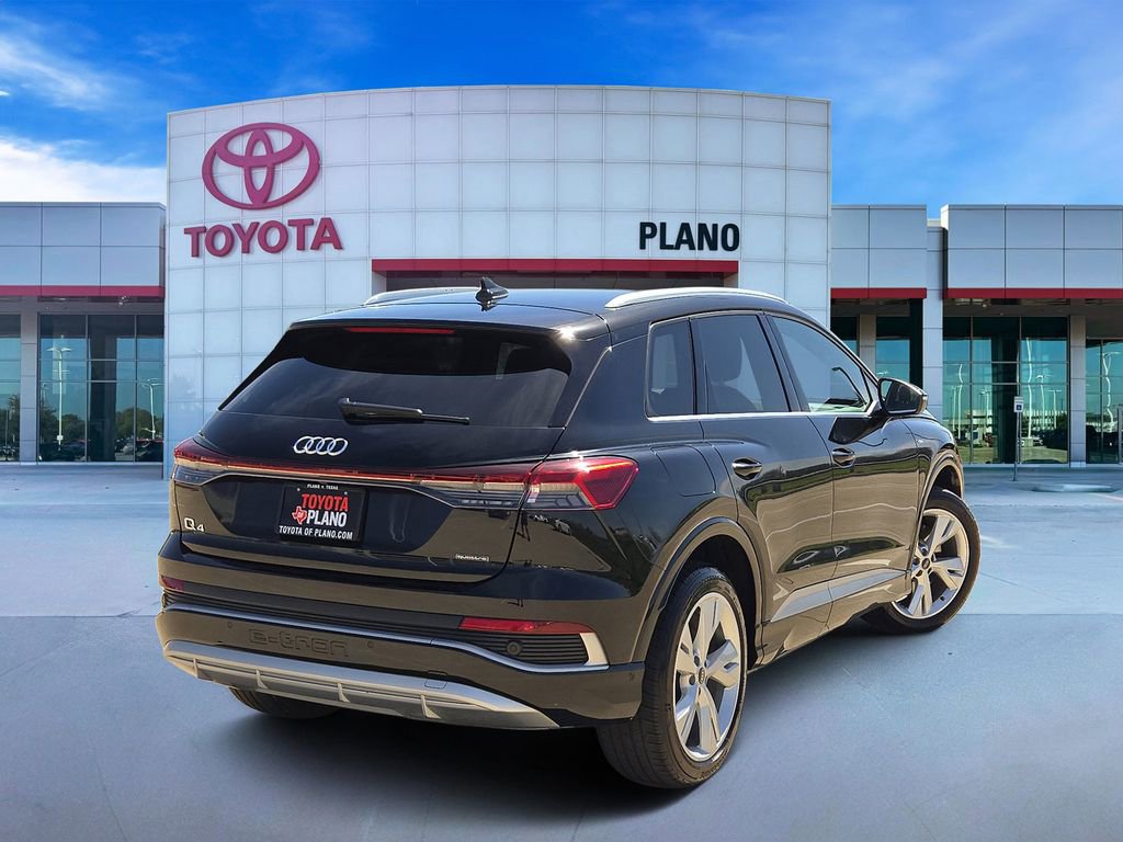 Mythos Black Metallic 2023 Audi Q4 e-tron Premium Plus quattro Single-Speed Automatic Electric Motor 20" Wheel Package, Adaptive Cruise Assist w/Lane Guidance, Alarm System w/Motion Sensor, Audi Advanced Key, Audi Connect PLUS, Audi MMI Navigation Plus, Audi Virtual Cockpit Plus, Auto-Dimming Interior Mirror w/Compass, Auto-Dimming Power Folding Exterior Mirrors, Convenience Package, Dual-Pane Acoustic Glass for Front Side Windows, Hands-Free Power Tailgate, Heated Steering Wheel, LED Interior Lighting Plus Package, Memory for Driver's Seat, Park Assist Plus, Power Front Passenger Seat, Premium Plus, Projection Light in Exterior Mirrors, SiriusXM w/360L, SONOS Premium Sound System, Traffic Sign Recognition, Wheels: 20" 5-Y-Spoke Design, Wireless Phone Charging Pad. Recent Arrival! 97/87 City/Highway MPG. Please verify any information in question with Toyota Of Plano.