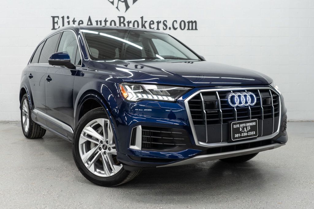 2023 Audi Q7 Premium Quattro AWD. 37k mi. One owner Clean Carfax! *MSRP $66,465* Navigation, Surround View Camera, Blind Spot Assist, Panoramic Sunroof, Heated front, 3rd row seat, Power folding side mirrors, Satellite Radio, Apple CarPlay, Bluetooth, 3-Zone climate control, Power tailgate and much more. This Audi features a beautiful Navarra Blue Metallic exterior over Black leather interior and wood trim. Showroom ready!