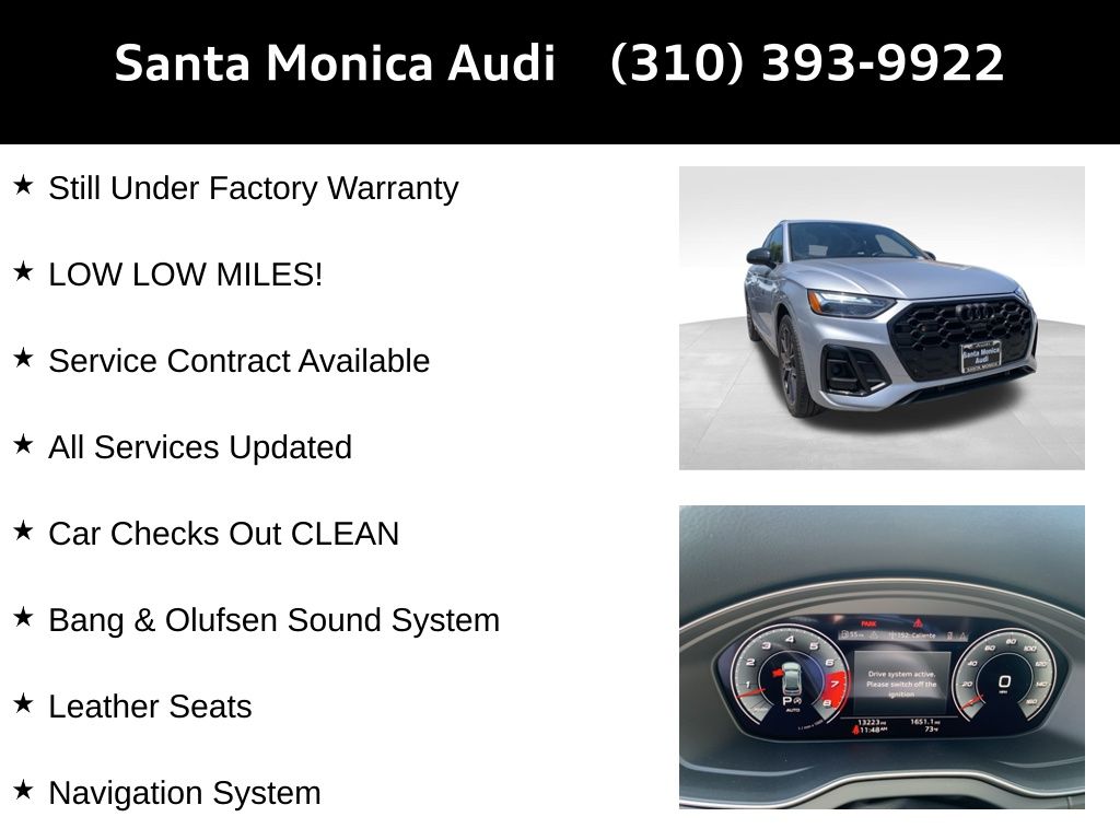 The 2023 Audi SQ5 Premium Plus is a luxury SUV with quattro all-wheel drive, offering a comfortable and sporty driving experience. It features a 3.0L TFSI engine, 8-speed automatic transmission, and a range of premium options including a Bang & Olufsen sound system and navigation. With low mileage and still under factory warranty, this SUV is in excellent condition.