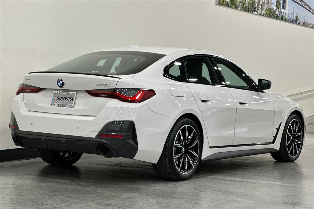 Alpine White 2023 BMW 4 Series 430i Gran Coupe RWD 8-Speed Automatic Sport 2.0L 4-Cylinder DOHC 16V Turbocharged Aerodynamic Kit, Ambient Lighting, Black Mirror Caps, Extended Shadowline Trim, Heated Front Seats, Heated Steering Wheel, Increased Top Speed Limiter, Lumbar Support Driver, M Shadowline Lights, M Sport Brakes w/Red Calipers, M Sport Package, M Sport Package (337), M Sport Package Pro (33B), M Sport Suspension, M Steering Wheel, Navigation System, Premium Package, Rear Spoiler, Shadowline Exterior Trim, Shadowline Package, Variable Sport Steering, Wheels: 19" x 8.5" Fr & 19" x 9.0" Rr M (3FM), Without Lines Designation Outside. WHY BUY FROM US Weatherford BMW is part of the Sunwise Automotive Group, one of the Bay Area's fastest growing groups of automotive retailers. At all our dealerships, we offer a Fair, Fast & Friendly guest experience designed to save you time. Start and finish your shopping experience online or visit us in person. Our digital retailing is customized for you and your lifestyle. As the only automotive group to own and operate three BMW Centers in the Bay Area, we offer an exceptional selection of new and Certified Pre-Owned BMW's. You'll find our Service and Parts Departments to be customer-focused and state of the art with factory-trained technicians using original equipment BMW parts. We look forward to serving you. Odometer is 26922 miles below market average! 25/34 City/Highway MPG