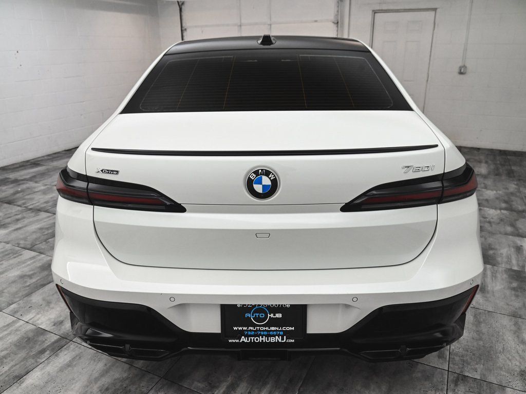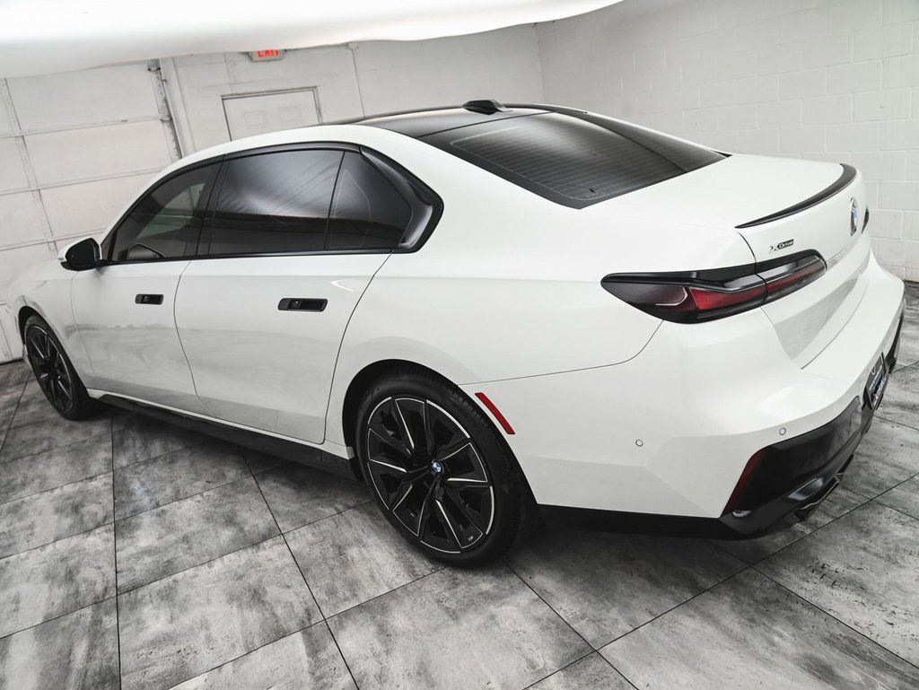 Mineral White Metallic 2023 BMW 7 Series 760i xDrive AWD 8-Speed Automatic Sport 4.4L V8 32V Twin Turbocharged. This vehicle offers an excellent interior with Merino leather, a genuine wood dashboard insert, and a panoramic LED roof. The exterior is finished in Mineral White Metallic with a Black and Atlas Gray design. The car features advanced technology, premium sound, and a suite of driver assistance systems. With only 35,967 miles, it offers a blend of luxury, performance, and safety.