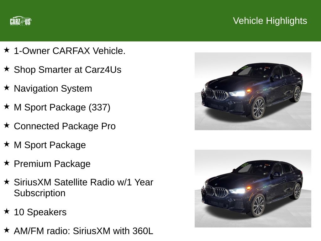 CARZ4US–Your Auto-Buying Experience is Always Better with Us! At CARZ4US, we are dedicated to providing top-quality vehicles, unmatched customer service, and a stress-free buying experience. With the highest Google review ratings, flexible financing options, and a guarantee that everyone gets approved, we make Car-buying simple, reliable, and rewarding. CARZ4US partners with trusted lenders like Capital One to secure the best financing rates and works with providers like Allstate to offer premium protection plans tailored to your needs. You can drive with confidence knowing you’re getting the best deal and coverage. With convenient locations in South Hackensack, NJ, and Pine Brook, NJ, we are ready to serve you wherever you are. Stop by either location to explore our 300+ vehicles in stock, offering options to Fit every budget, and experience exceptional service firsthand. Ready to get started? Contact us today at 855-227-9487, book your appointment, and follow us on Instagram at @carz4us.auto for the latest updates and deals! Elevate Your Driving Experience with this Stunning 2023 BMW X6 xDrive40i Discover the ultimate in performance, style, and luxury with this exceptional 2023 BMW X6 xDrive40i. Boasting a sleek, sophisticated exterior in Black and a meticulously crafted interior, this vehicle is poised to captivate and impress. Under the hood, this BMW X6 is powered by a potent 3.0L I6 DOHC 24V engine, mated to an 8-Speed Automatic Sport transmission and BMW’s renowned xDrive all-wheel-drive system. With an EPA-estimated 21 MPG in the city and 25 MPG on the highway, this SUV delivers exceptional performance and efficiency. Step inside and be enveloped in the luxurious cabin, featuring 4-Zone Automatic Climate Control, Heated Front Seats, Armrests, and Steering Wheel, as well as a Head-Up Display and Wireless Charging for your convenience. The premium sound system and Apple CarPlay/Android Auto compatibility ensure you can enjoy your favorite music and stay connected on the go. Safety and technology are also at the forefront, with features like the Adaptive M Suspension, Exterior Parking Camera Rear, and BMW Assist eCall emergency communication system. The M Sport Package adds even more excitement, with an aerodynamic kit, Shadowline Exterior Trim, and stunning 20-inch M Star-Spoke Bi-Color wheels. Don’t just buy a Car—experience the CARZ4US difference! With our unbeatable selection, expert financing options, and commitment to your satisfaction, there’s no better place to find your next vehicle. Visit us today and let our team help you drive home in the Car you’ve been dreaming of! Contact us today at 855-227-9487 and follow us on Instagram at @carz4us.auto to stay updated on the latest deals and inventory. Visit us and experience the difference!