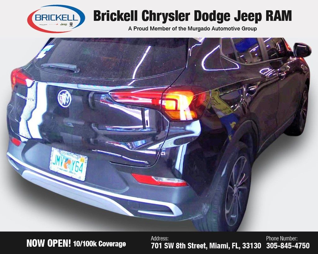 Ebony Twilight Metallic 2023 Buick Encore GX Select FWD CVT ECOTEC 1.2L Turbo. Find Your Perfect Pre-Owned Vehicle at Brickell Chrysler Dodge Jeep Ram. At Brickell CDJR, we make buying a pre-owned vehicle easy and stress-free. Every pre-owned vehicle is thoroughly inspected to ensure quality and reliability. For added confidence, we include a 10-year/100,000-mile powertrain warranty on all non-European brands at no additional cost. Our dealership offers one of the largest selections of pre-owned inventory in the region, so you can find the right car, truck, or SUV for your needs. Our state-of-the-art service department, the largest in the country, is open seven days a week from 7 AM to 9 PM, ensuring your vehicle stays in top condition. Visit us at 7018 SW 8th St, Miami, FL 33130.