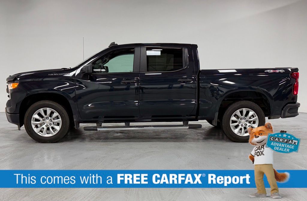 One Owner, Clean Car Fax, Recent Arrival! Dark Ash Metallic 2023 Chevrolet Silverado 1500 4D Crew Cab Custom 2.7L Turbo 4WD Clean CARFAX. 8-Speed Automatic, 4WD, Black Cloth. This Silverado 1500 is well equipped with Custom Convenience Package (Electric Rear-Window Defogger, EZ Lift Power Lock & Release Tailgate, LED Cargo Area Lighting, Remote Vehicle Starter System, and Theft Deterrent System (Unauthorized Entry)), Custom Value Package, High Capacity Suspension Package, Preferred Equipment Group 1CX (10-Way Power Driver Seat w/Lumbar, 120-Volt Bed Mounted Power Outlet, 120-Volt Instrument Panel Power Outlet, 3.5" Monochromatic Display Driver Info Center, Bluetooth For Phone, Chevrolet Connected Access Capable, Color-Keyed Carpeting Floor Covering, Compass, Deep-Tinted Glass, Dual Rear USB Ports (Charge Only), Electrical Steering Column Lock, Electronic Cruise Control, Front Frame-Mounted Black Recovery Hooks, Front Rubberized Vinyl Floor Mats, HD Rear Vision Camera, Manual Tilt Wheel Steering Column, OnStar & Chevrolet Connected Services Capable, Power Front Windows w/Driver Express Up/Down, Power Front Windows w/Passenger Express Down, Power Rear Windows w/Express Down, Rear 60/40 Folding Bench Seat (Folds Up), Rear Rubberized-Vinyl Floor Mats, Remote Keyless Entry, SiriusXM Radio, Standard Tailgate, Wi-Fi Hot Spot Capable, and Wireless Phone Projection), Trailering Package (Hitch Guidance), 8-Speed Automatic, 4WD, Black Cloth, 3.42 Rear Axle Ratio, 4-Wheel Disc Brakes, 40/20/40 Front Split-Bench Seat, 6 Speakers, 6-Speaker Audio System, ABS brakes, Air Conditioning, Alloy wheels, AM/FM radio: SiriusXM, Apple CarPlay/Android Auto, Auto High-beam Headlights, Auto-Locking Rear Differential, Automatic Emergency Braking, Brake assist, Bumpers: body-color, Cloth Seat Trim, Delay-off headlights, Driver door bin, Driver vanity mirror, Dual front impact airbags, Dual front side impact airbags, Electronic Stability Control, Following Distance Indicator, Forward Collision Alert, Front anti-roll bar, Front Center Armrest w/Storage, Front Pedestrian Braking, Front reading lights, Front wheel independent suspension, Fully automatic headlights, Heated door mirrors, Illuminated entry, IntelliBeam Automatic High Beam On/Off, Lane Keep Assist w/Lane Departure Warning, Low tire pressure warning, Not Equipped w/Rear USB Ports, Not Equipped w/Steering Column Lock, Occupant sensing airbag, Outside temperature display, Overhead airbag, Overhead console, Panic alarm, Passenger door bin, Passenger vanity mirror, Power door mirrors, Power driver seat, Power steering, Power windows, Premium audio system: Chevrolet Infotainment 3, Radio data system, Radio: Chevrolet Infotainment 3 System, Rear reading lights, Rear step bumper, Rear window defroster, Remote keyless entry, Security system, Speed control, Speed-sensing steering, Split folding rear seat, Tachometer, Tilt steering wheel, Traction control, Trip computer.