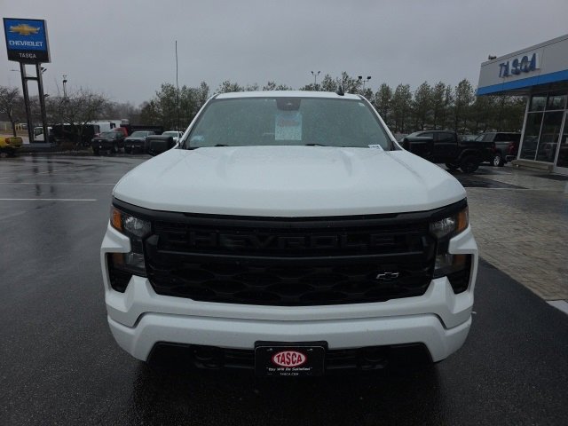 The 2023 Chevrolet Silverado 1500 Custom Four Wheel Drive Crew Cab features a 2.7L Turbo High-Output engine paired with an 8-speed automatic transmission. This truck offers a comfortable interior with a split-bench front seat, rear window defogger, and single-zone climate control. The exterior is Summit White, complemented by Jet Black cloth seat trim. Advanced safety and technology features include Forward Collision Alert, Lane Keep Assist, Apple CarPlay capability, and a Chevrolet Infotainment 3 System with a color touchscreen.