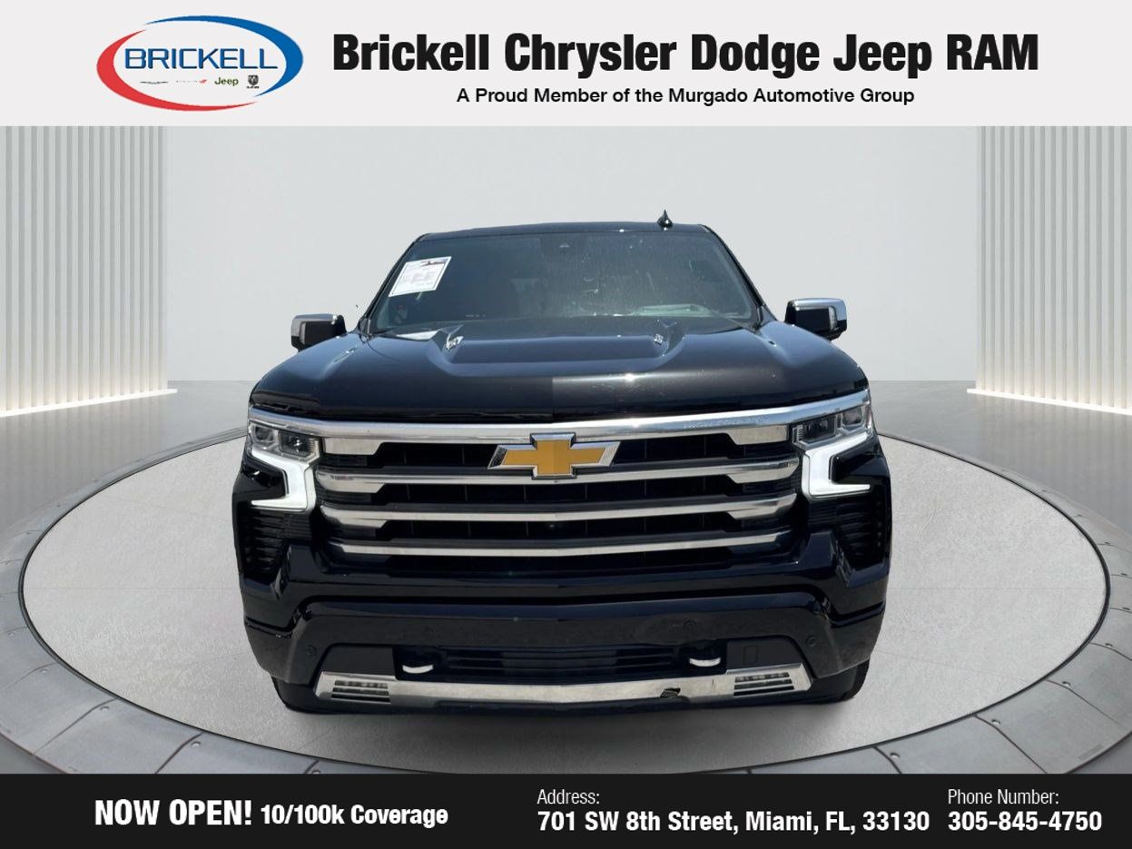 Black 2023 Chevrolet Silverado 1500 High Country 4WD 10-Speed Automatic EcoTec3 6.2L V8 10-Speed Automatic, 4WD, Jet Black/Nightshift Blue Leather. Find Your Perfect Pre-Owned Vehicle at Brickell Chrysler Dodge Jeep Ram At Brickell CDJR, we make buying a pre-owned vehicle easy and stress-free. Every pre-owned vehicle is thoroughly inspected to ensure quality and reliability. For added confidence, we include a 10-year/100,000-mile powertrain warranty on all non-European brands at no additional cost. Our dealership offers one of the largest selections of pre-owned inventory in the region, so you can find the right car, truck, or SUV for your needs. Our state-of-the-art service department, the largest in the country, is open seven days a week from 7 AM to 9 PM, ensuring your vehicle stays in top condition. Visit us at 701 SW 8th St, Miami, FL 33130, or call 305-777-2800 to learn more and schedule a test drive. The displayed price includes an incentive for financing with Brickell CDJR Finance Company. Price does not include our Perma-Plate. Outside financing and bank drafts are not accepted. All pre-owned vehicle exports are subject to an export fee. Taxes, title, registration, and dealer fees apply. Recent Arrival!
