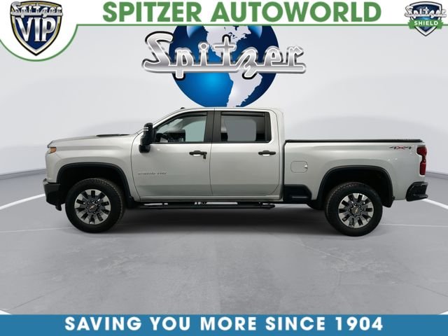 2023 Chevrolet Silverado 2500HD 4D Crew Cab Custom 4WD CARFAX One-Owner. Customer traded in on a 2026 Silverado 1500 RST, sold their camper and wanted to downgrade in size. Cloth black seats, tilt steering wheel, cruise control, power locks and windows, power heated mirrors, back up camera, remote start, keyless entry, 7” touch screen, air conditioning, convenience package, Bluetooth, Sirius XM Radio, OnStar, Mp3 Player, spray-in bed liner, running boards, Truxport soft tonneau cover, running boards, mud flaps, bug shield, vent visor, trailer brake controller, towing package, 10,650 pound towing capacity, Apple CarPlay and Android Auto, Safety Confidence Package, custom convenience package. 6.6L V8, Silver Ice Metallic, black cloth. 6.6L V8 Silver Ice Metallic.