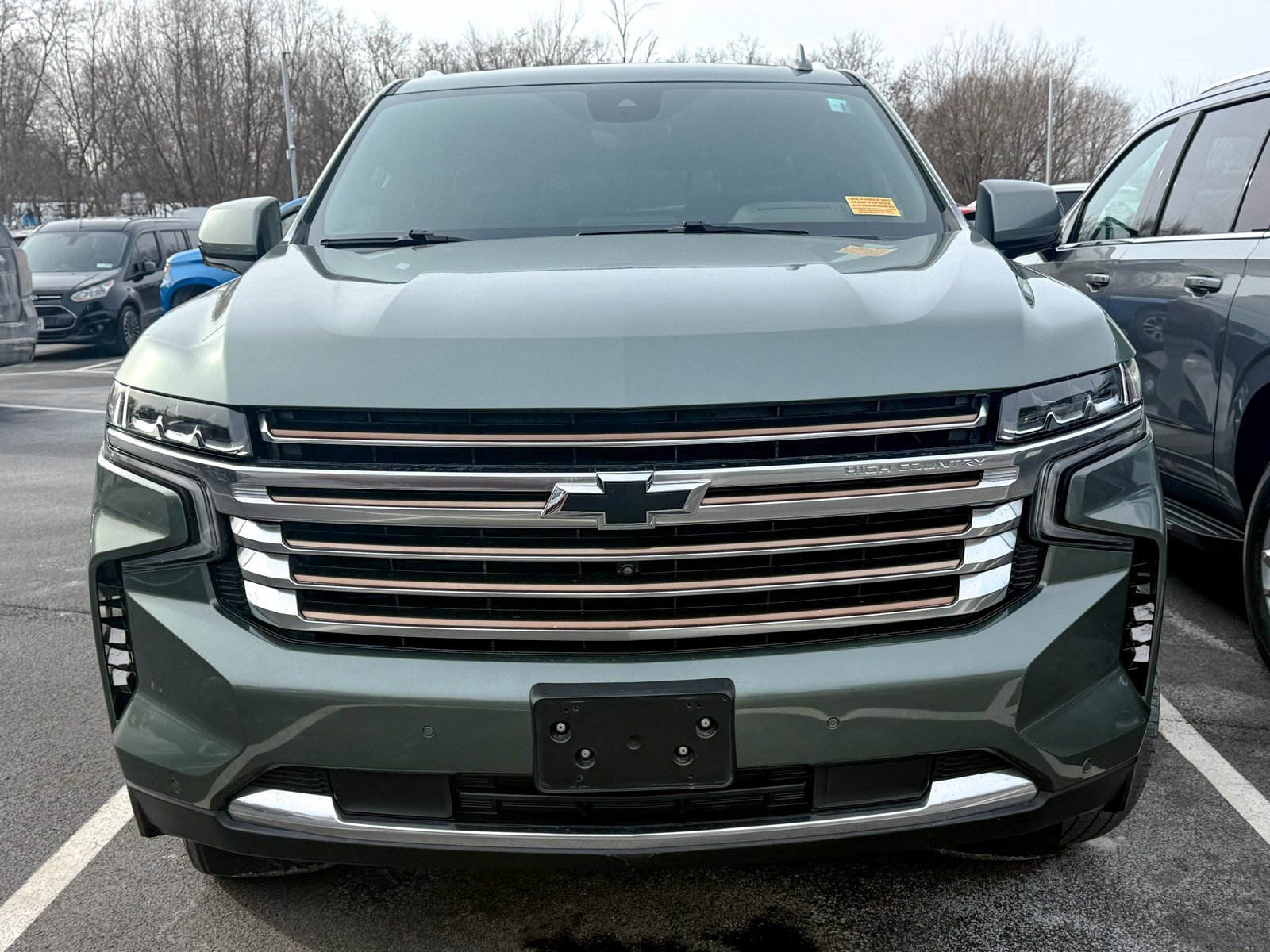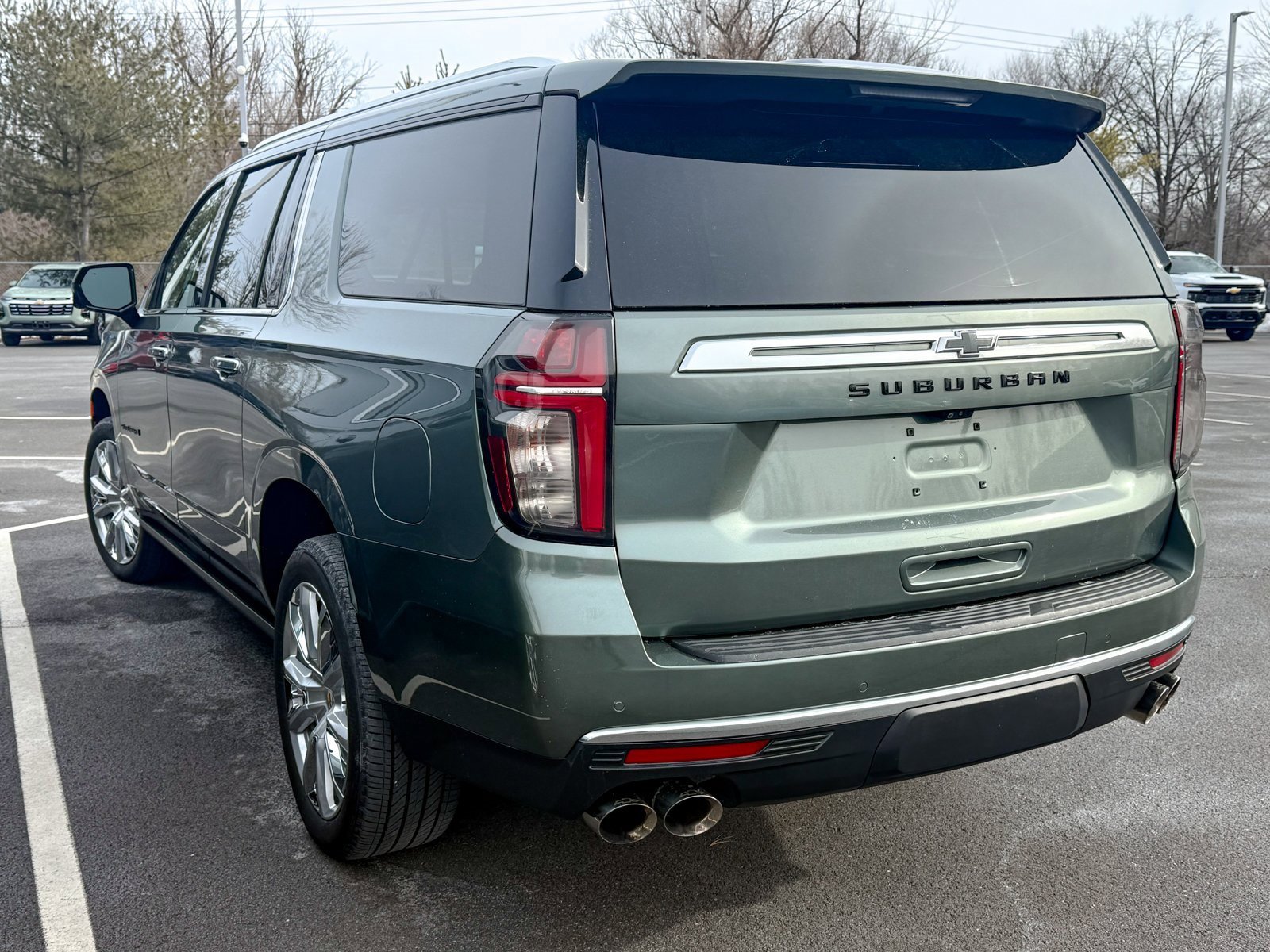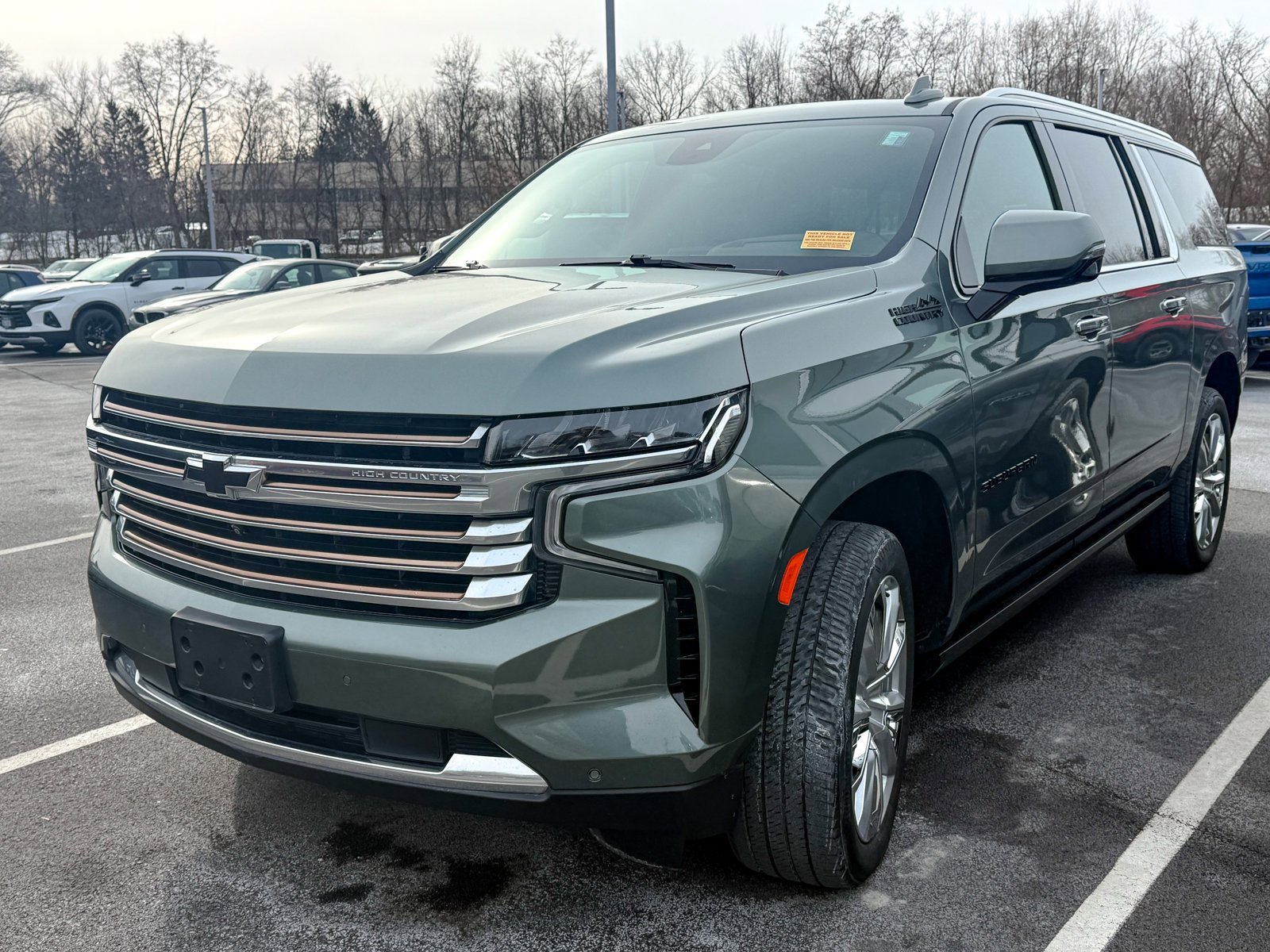 Silver Sage Metallic 2023 Chevrolet Suburban High Country 4WD 10-Speed Automatic with Overdrive EcoTec3 6.2L V8 Dual-Pane Power Panoramic Sunroof, 10 Speakers, 15 Diagonal Multi-Color Head-Up Display, 1st & 2nd Row Color-Keyed Carpeted Floor Mats, 2-Speed Active Electronic AutoTrac Transfer Case, 3rd Row 60/40 Power-Folding Split-Bench, 3rd row seats: split-bench, 4-Wheel Disc Brakes, ABS brakes, Adaptive Cruise Control, Adaptive suspension, Air Conditioning, Alloy wheels, AM/FM radio: SiriusXM with 360L, Apple CarPlay/Android Auto, Auto High-beam Headlights, Auto-dimming door mirrors, Auto-dimming Rear-View mirror, Auto-leveling suspension, Automatic temperature control, Black Name Plates (LPO), Bose 10-Speaker Surround w/CenterPoint, Brake assist, Bright Front & Rear Door Sill Plates, Bumpers: body-color, Cat-Back Performance Exhaust (LPO), Chrome Door Handles w/Body-Color Strip, Color-Keyed Carpeting Floor Covering, Compass, Delay-off headlights, Driver & Front Outboard Passenger Airbags, Driver door bin, Driver vanity mirror, Dual Exhaust System, Dual front impact airbags, Dual front side impact airbags, Electronic Stability Control, Emergency communication system: OnStar and Chevrolet connected services capable, Enhanced Automatic Emergency Braking, Enhanced Driver Information Center, Exterior Parking Camera Rear, Floor Console, Four wheel independent suspension, Front & Rear Black Bowtie Emblems (LPO), Front anti-roll bar, Front Bucket Seats, Front Center Armrest, Front dual zone A/C, Front reading lights, Fully automatic headlights, Garage door transmitter, Hands-Free Rear Power Programmable Liftgate, HD Surround Vision, Heads-Up Display, Heated & Ventilated Driver & Front Passenger Seats, Heated 2nd Row Outboard Seats, Heated door mirrors, Heated Driver & Front Passenger Seats, Heated front seats, Heated rear seats, Heated Steering Wheel, Heated steering wheel, Hill Descent Control, Illuminated entry, Illuminated Front & Rear Door Sill Plates (LPO), Illuminated Liftgate Sill Plate (LPO), Illuminated Mirror Chevrolet Emblem (LPO), Illumination Package (LPO), Infotainment Display, Inside Rearview Auto-Dimming Rear Camera Mirror, Lane Change Alert w/Side Blind Zone Alert, LED Daytime Running Lamps, License Plate Front Mounting Package, Low tire pressure warning, Magnetic Ride Control Suspension, Memory seat, Memory Settings, Navigation System, Not Equipped w/4-Way Driver & Fr Pass Pwr Lumbar, Not Equipped w/Wheel Locks (LPO), Not Equipped w/Wireless Charging, Occupant sensing airbag, Outside Heated Power-Adjustable Mirrors, Outside temperature display, Overhead airbag, Overhead console, Panic alarm.