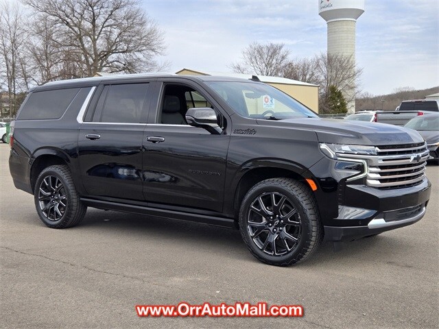 Recent Arrival! 2023 Chevrolet Suburban High Country Black. License Plate Front Mounting Package, Preferred Equipment Group 3LZ (15" Diagonal Multi-Color Head-Up Display, 1st & 2nd Row Color-Keyed Carpeted Floor Mats, 2-Speed Active Electronic AutoTrac Transfer Case, 3rd Row 60/40 Power-Folding Split-Bench, Bose 10-Speaker Surround w/CenterPoint, Bright Front & Rear Door Sill Plates, Chrome Door Handles w/Body-Color Strip, Color-Keyed Carpeting Floor Covering, Driver & Front Outboard Passenger Airbags, Dual Exhaust System, Enhanced Automatic Emergency Braking, Enhanced Driver Information Center, Floor Console, Hands-Free Rear Power Programmable Liftgate, HD Surround Vision, Heated & Ventilated Driver & Front Passenger Seats, Heated 2nd Row Outboard Seats, Heated Driver & Front Passenger Seats, Heated Steering Wheel, Hill Descent Control, Infotainment Display, Inside Rearview Auto-Dimming Rear Camera Mirror, Lane Change Alert w/Side Blind Zone Alert, LED Daytime Running Lamps, Memory Settings, Outside Heated Power-Adjustable Mirrors, Power Release 2nd Row Bucket Seats, Power Tilt & Telescopic Steering Column, Rear Camera Mirror Washer, Rear Cross Traffic Alert, Rear Pedestrian Alert, Remote Start, Safety Alert Seat, SiriusXM Radio w/360L, Universal Home Remote, Wireless Charging, and Wrapped Steering Wheel), Premium Package 2 (Dual-Pane Power Panoramic Sunroof and Power-Retractable Assist Steps), 10 Speakers, 3.23 Rear Axle Ratio, 3rd row seats: split-bench, 4-Wheel Disc Brakes, ABS brakes, Adaptive Cruise Control, Adaptive suspension, Air Conditioning, Alloy wheels, AM/FM radio: SiriusXM with 360L, Apple CarPlay/Android Auto, Auto High-beam Headlights, Auto-dimming door mirrors, Auto-dimming Rear-View mirror, Auto-leveling suspension, Automatic temperature control, Black Name Plates (LPO), Brake assist, Bumpers: body-color, Cargo Security Shade (LPO), Compass, Delay-off headlights, Driver door bin, Driver vanity mirror, Dual front impact airbags, Dual front side impact airbags, Electronic Stability Control, Emergency communication system: OnStar and Chevrolet connected services capable, Exterior Parking Camera Rear, Four wheel independent suspension, Front & Rear Black Bowtie Emblems (LPO), Front anti-roll bar, Front Bucket Seats, Front Center Armrest, Front dual zone A/C, Front reading lights, Fully automatic headlights, Garage door transmitter, Heads-Up Display, Heated door mirrors, Heated front seats, Heated rear seats, Heated steering wheel, Illuminated entry, Low tire pressure warning, Magnetic Ride Control Suspension, Memory seat, Navigation System, Occupant sensing airbag, Outside temperature display, Overhead airbag, Overhead console, Panic alarm, Passenger door bin, Passenger vanity mirror, Perforated Leather Seating Surfaces, Power door mirrors, Power driver seat, Power Liftgate, Power passenger seat, Power steering, Power windows, Premium audio system: Chevrolet Infotainment 3 Premium, Radio: Chevrolet Infotainment 3 Premium System, Rain sensing wipers, Rear air conditioning, Rear anti-roll bar, Rear reading lights, Rear window defroster, Rear window wiper.