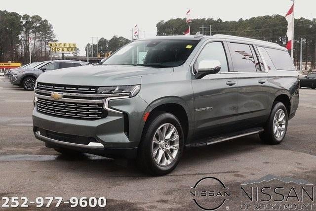 Silver Sage Metallic 2023 Chevrolet Suburban Premier RWD 10-Speed Automatic with Overdrive EcoTec3 5.3L V8. We are one of the leading Chevrolet dealers for selling the used 2023 Chevrolet Suburban Rocky Mount. Our customers come to our Nissan dealership showroom located in Rocky Mount, Tarboro, Roanoke Rapids, and Wilson, NC. Rocky Mount, NC customers like our great pricing. Tarboro, customers appreciate our fantastic service. Rocky Mount, NC customers know they will have a great shopping experience. Roanoke Rapids, NC customers love our friendly employees. Wilson, NC customers know that we are one of the leading Nissan dealerships in the Rocky Mount, NC area and serve the Rocky Mount market. Whether you are from Rocky Mount, Tarboro, Roanoke Rapids, and Wilson, NC, we hope you will give us a chance to show why Nissan of Rocky Mount Nissan of Rocky Mount, North Carolina is the one of the best Nissan dealers selling and servicing 2023 Chevrolet Suburban 4D Sport Utility 2WD Premier in the Rocky Mount, area.