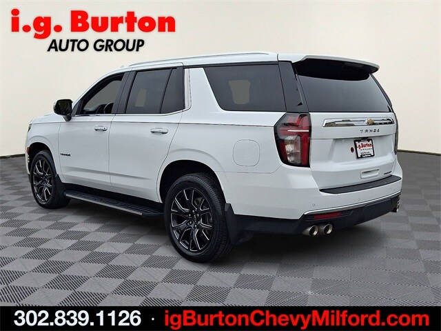 See it at the Milford Chevy location, Bluetooth hands free phone, Backup Camera, Leather Seating, 4x4, Remote Starter, 4WD, Jet Black Leather, 1st & 2nd Row Color-Keyed Carpeted Floor Mats, 2-Speed Active Electronic AutoTrac Transfer Case, 3rd Row 60/40 Power-Folding Split-Bench Seat, Advanced Trailering Package, Auto-Dimming Inside Rear-View Mirror, Bose 10-Speaker Centerpoint Surround Audio Sys Ft, Bright Front & Rear Door Sill Plates, Chrome Door Handles w/Body-Color Strip, Chrome Mirror Caps, Color-Keyed Carpeting Floor Covering, Driver & Front Outboard Passenger Airbags, Dual Exhaust System, Enhanced Driver Information Center, Extra Capacity Cooling System, Floor Console, Hands-Free Rear Power Programmable Liftgate, Heated 2nd Row Outboard Seats, Heated Steering Wheel, Hill Descent Control, Hitch Guidance w/Hitch View, Infotainment Display, Integrated Trailer Brake Controller, Lane Change Alert w/Side Blind Zone Alert, LED Daytime Running Lamps, Max Trailering Package, Memory Settings, Navigation System, Outside Heated Power-Adjustable Mirrors, Power Release 2nd Row Bucket Seats, Power Tilt & Telescopic Steering Column, Preferred Equipment Group 1LZ, Rear Cross Traffic Alert, Remote Start, Safety Alert Seat, SiriusXM Radio w/360L, Smart Trailer Integration Indicator, Trailer Side Blind Zone Alert, Universal Home Remote, Wireless Charging, Wrapped Steering Wheel. 2023 Chevrolet Tahoe Premier. CARFAX One-Owner. Clean CARFAX. Since 1908, i.g. Burton Auto Group has served Delmarva and its surrounding communities with outstanding sales and service as its longest-standing family-owned and operated dealer group. See why we proudly say, "Nobody Beats a Burton Deal! NOBODY!" Final Conditional Prices include ALL applicable rebates and incentives. Not all customers will qualify for all rebates and incentives. See dealer for details. All conditions subject to credit approval. While we make every effort to ensure the data listed here is correct, there may be instances where rebates, incentives, options or vehicle features may be listed incorrectly. Please contact dealer to verify payment, price, and options. Dealer cannot be held liable for omissions or errors prior sale. Stock OEM pictures may not represent actual vehicle. Specifications, features, safety and warranty data are based on what is available as standard specs/features per trim level, for designated model-year and may not apply to vehicles with added features or options.