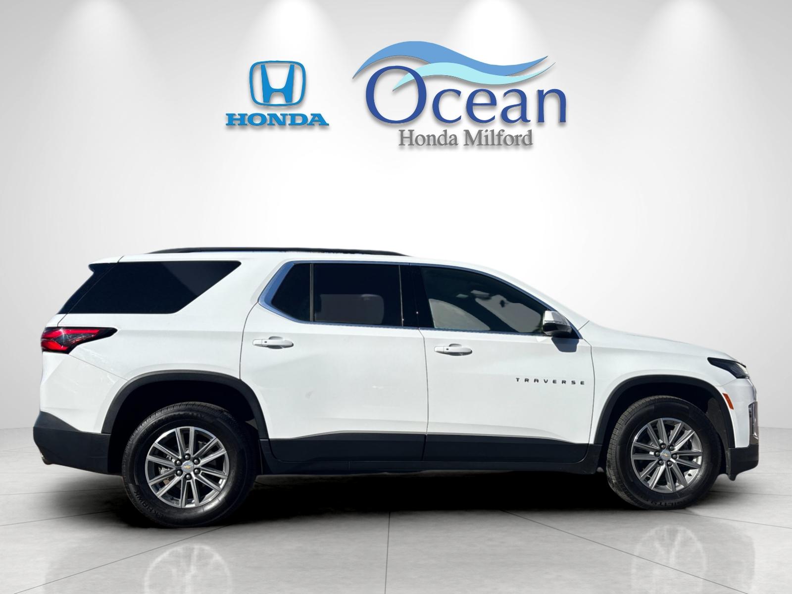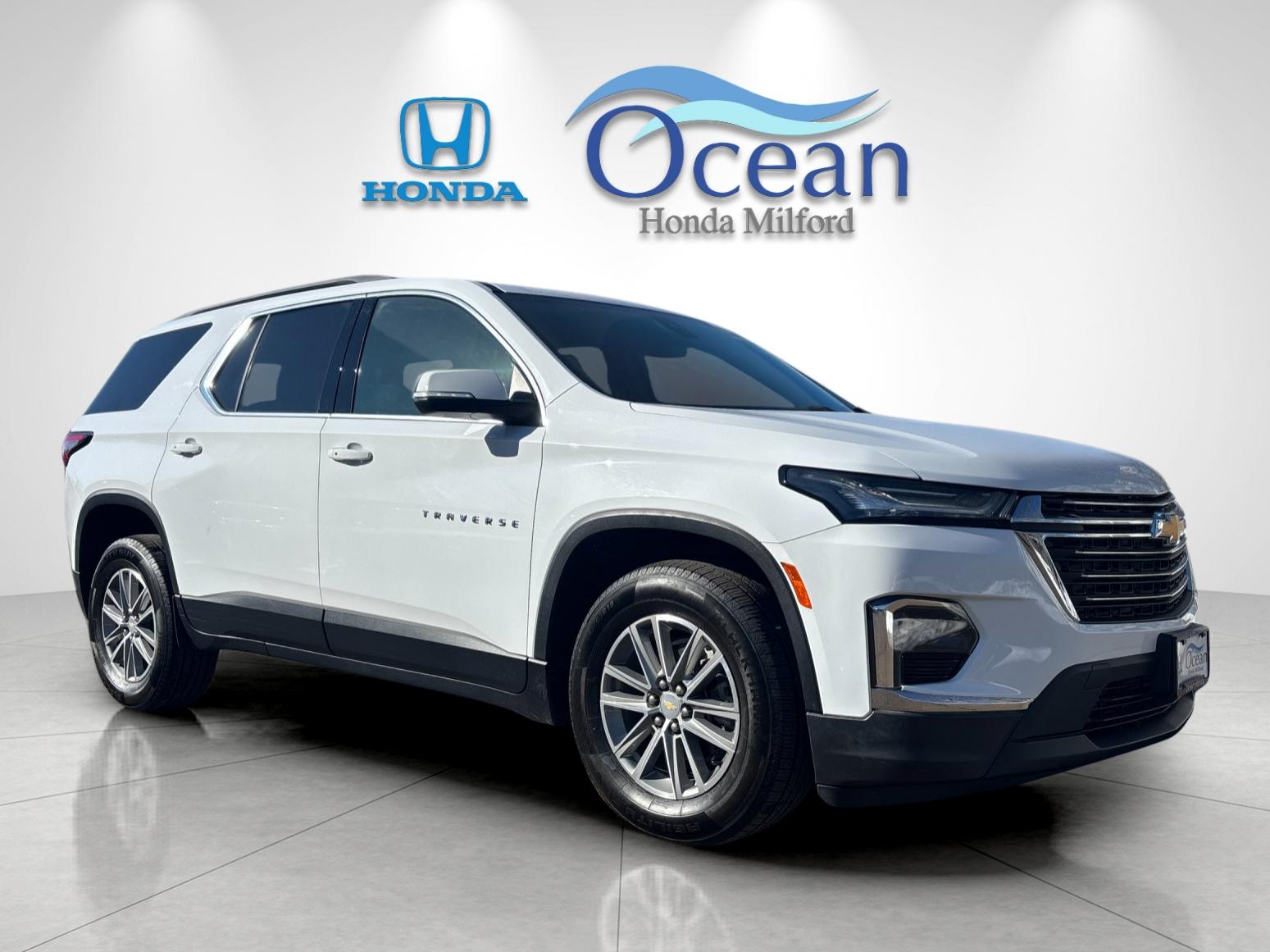 This handsome Summit White 2023 Chevrolet Traverse 1LT Cloth AWD was recently acquired to our store here in Milford! This 1 Owner was acquired locally and maintained on time. The 1LT combines space, comfort, and versatility. The Jet Black/Chai interior and 7-passenger layout make daily use simple and practical. We just completed our Victory 182-point inspection, performed a maintenance inspection and battery test, topped off all fluids, and finished a full interior and exterior detail. Two keys included. Recent service records show oil and filter changes, tire rotations, and GPS/navigation system installation. This beauty has had and passed an extensive Victory 182-point inspection conducted by our factory certified technicians. Buy with confidence. Every Ocean Honda Pre-Owned vehicle includes a 90 day or 3,000-mile comprehensive warranty on top of any remaining factory coverage. Includes Car Doc Connect for automated 24/7 vehicle health scans, nationwide stolen vehicle recovery, real time location with geo tag data and smart alerts, live battery and fuel levels, recall status, and maintenance scheduling from your phone. Ownership includes our Car Doc maintenance plan with 6 complimentary oil changes and 3 complimentary tire rotations during the first two years. Upgrade to a 3 year or 5-year Car Doc along with other perks to give you peace of mind when it comes to your driving experience. It is just what the doctor ordered! We are in the business of building relationships, not just selling vehicles. Our large national group of dealerships has relationships with nearly every national bank and credit union. If you need help with financing or finding the best rate, we are the dealership that can help! Whether you have good credit, bad credit or no credit. Get Pre-Approved Today at: [https://www.oceanhondamilford.com/finance/get-pre-approved/](https://www.oceanhondamilford.com/finance/get-pre-approved/)