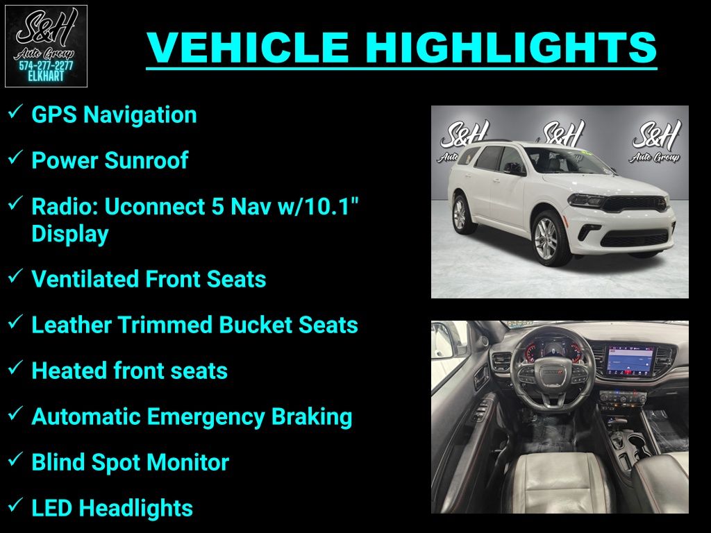 Clean CARFAX. AWD. White Knuckle Clearcoat 2023 Dodge Durango GT Plus AWD 8-Speed Automatic 4D Sport Utility 3.6L V6 24V VVT 18/25 City/Highway MPG. At S & H we pride ourselves on our outstanding customer service, our transparent sales process and our rock bottom prices! Recent Arrival! Enjoy the benefits of certified service near Mishawaka IN, South Bend IN, Niles MI and Edwardsburg MI at the S&H Motor Sales Service Center. If you're anything like us, you love the feeling of driving a preowned car, and you want your car to feel like new for years and years to come. Fortunately, one of the best ways to ensure that, and avoid costly repairs in the future is to keep up with your manufacturer-recommended maintenance. And with years of preowned service expertise under our belts here at S&H Motor Sales, there's no one better equipped to serve your car care needs than we are.