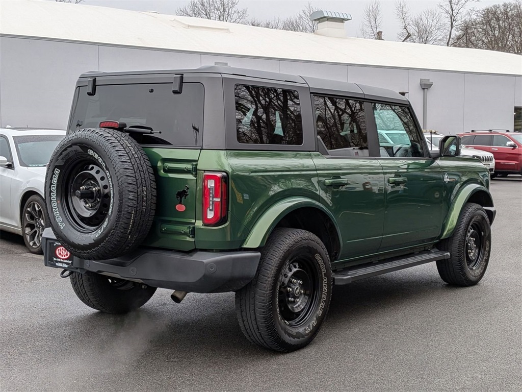 The 2023 Ford Bronco Outer Banks Advanced delivers iconic off-road capability blended with premium comfort and everyday usability, making it a standout opportunity for drivers who want rugged performance without sacrificing refinement, and this example includes the original factory wheels and tires in addition to the wheels currently installed, providing added value, flexibility, and peace of mind for the next owner. This CarFAX One-Owner Bronco comes with No Accidents Reported, a strong service history, and was personally owned, now showing 36,859 miles, driven responsibly and well maintained throughout ownership. Powered by a proven 2.3L EcoBoost turbocharged 4-cylinder engine paired with a smooth 10-speed automatic transmission and advanced 4x4 system, it delivers confident on-road manners along with true off-road capability. The Outer Banks Advanced package enhances both style and function with 18-inch machined black aluminum wheels, hard top with sound-deadening headliner, LED headlights with auto high beams, signature Bronco grille, and bold Eruption Green Metallic exterior. Inside, you'll enjoy leather-trimmed seating with vinyl accents, dual-zone automatic climate control, 12-inch center touchscreen with SYNC 4, connected navigation, 360-degree camera, Ford Co-Pilot360 driver-assist technology, push-button start, and G.O.A.T. Modes terrain management system for unmatched versatility across changing terrain and conditions. Recent maintenance includes oil and filter services and comprehensive inspections performed to ensure strong mechanical condition and reliability. Any open manufacturer recalls are covered by Ford and can be completed at an authorized dealer at no cost to the buyer. With its clean CARFAX, premium configuration, included factory wheels and tires, and proven Bronco capability, this vehicle represents a rare and compelling opportunity.