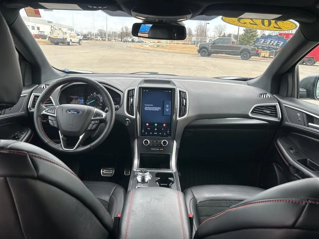 The 2023 Ford Edge ST Line offers a compelling blend of style, performance, and tech in a versatile SUV package. With just over 25,600 miles, this used model presents a sleek Carbonized Gray Metallic exterior complemented by a refined Ebony interior. Powered by a turbocharged 2.0-liter four-cylinder engine producing 250 horsepower and 280 lb-ft of torque, it delivers confident acceleration and smooth handling. Its 8-speed automatic transmission and all-wheel drive system ensure a responsive drive whether you're navigating city streets or tackling rougher terrain. Designed for modern drivers, this Edge features an array of connectivity options including Apple CarPlay, Bluetooth, and a WiFi hotspot, making every ride more enjoyable. Safety and convenience are enhanced with heated seats, keyless entry, push start, and advanced driver-assist features like blind spot monitoring, lane keep assist, and collision warning. With a spacious interior seating five and a user-friendly 12-inch infotainment touchscreen, this SUV is ready to meet your daily needs with style and reliability.