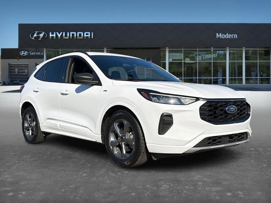 The 2023 Ford Escape ST-Line with optional equipment stands out with 18-inch rock metallic painted wheels wrapped in all-season tires and a sporty exterior featuring a black mesh grille, ST-Line badging, LED headlamps and taillamps, unique rear skid plates, a rear spoiler, black roof rack side rails, privacy glass, active grille shutters, and Ford's Easy Fuel capless filler, while the interior delivers an athletic feel with sport bucket seats trimmed in cloth and vinyl, red stitching accents throughout, a flat-bottom steering wheel with red stitching, aluminum sport pedals, dual-zone automatic climate control, a rotary gear shift dial, USB-A and USB-C ports, 12V powerpoints, and practical touches like rear seat cupholders and floor mats. All presented in excellent condition with no accidents reported for a stylish and performance-inspired compact SUV. Oxford White FWD 8-Speed Automatic 1.5L EcoBoost. CARFAX One-Owner. Clean CARFAX. Priced below KBB Fair Purchase Price! 2023 Ford Escape ST-Line The next step? Give us a call to confirm availability and schedule a hassle free test drive! Please Contact us at (888) 461-1599. WE ARE LOCATED AT 965 Concord Parkway South, Concord, NC 28027.