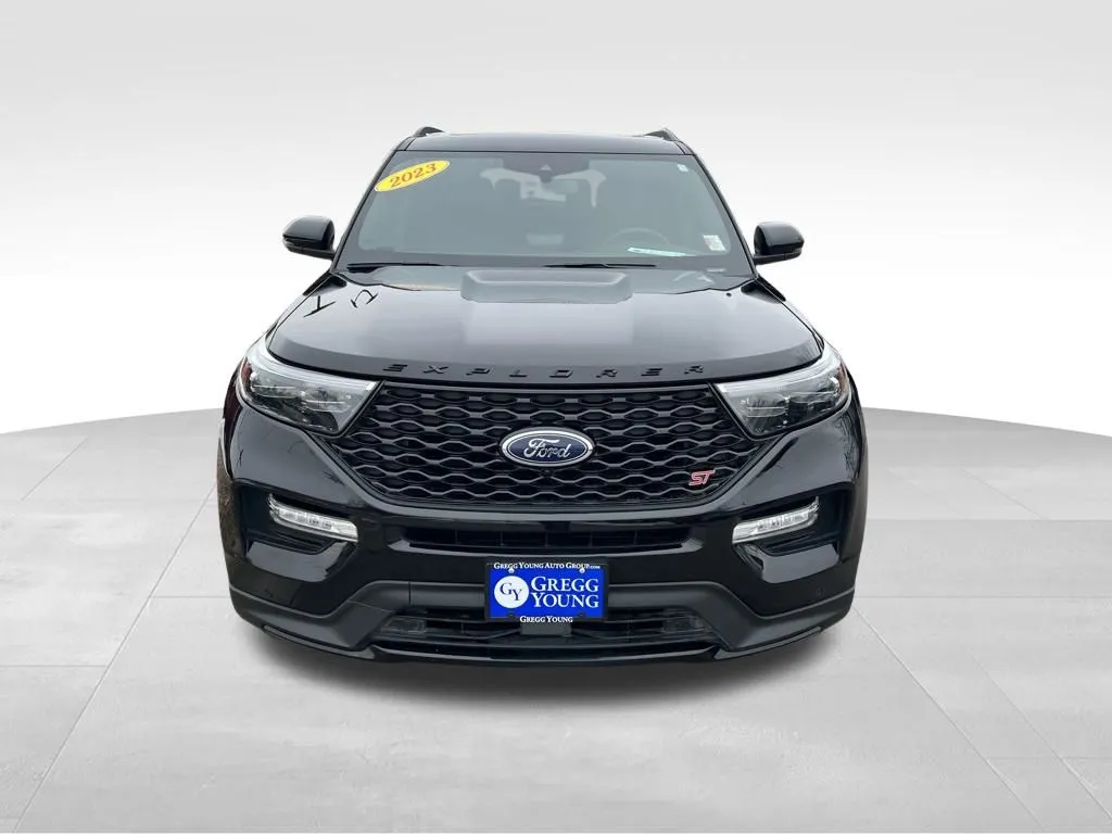Discover the 2023 Ford Explorer ST, a stunning used SUV that combines power, versatility, and advanced technology to elevate your driving experience. Finished in sleek Agate Black Metallic with an Ebony interior, this model boasts just 22,367 miles and is equipped with a robust 3.0-liter twin-turbocharged V6 engine delivering 400 horsepower and 415 lb-ft of torque. Its 10-speed automatic transmission and standard 4WD system ensure confident handling across diverse terrains. The Explorer ST features a spacious interior with seating for six, a third-row seat, and modern comforts such as heated seats, a sunroof/moonroof, and rear A/C. Connectivity is seamless with Apple CarPlay, Bluetooth, satellite radio, and a Wi-Fi hotspot, while driver-assist features like adaptive cruise control, blind spot monitoring, lane keep assist, collision warning, and parking sensors provide added safety and convenience. The inclusion of a backup camera, cross traffic alert, keyless entry, push start, and parking assist makes every journey effortless, whether commuting or heading off-road. This used Ford Explorer ST is a well-rounded vehicle packed with safety, entertainment, and performance features designed to meet the needs of modern drivers. It offers essential safety systems such as dual front knee airbags, rear parking sensors, four-wheel ABS, emergency braking readiness, auto-locking power door locks, cornering brake control, a rear camera system washer, a programmable safety key, and hill descent control for off-road confidence. These features work together to provide peace of mind on every drive, ensuring occupants are protected with comprehensive safety measures. The vehicle's advanced security and safety systems make it an excellent choice for families and adventurers alike. Under the hood, the Explorer ST offers cutting-edge entertainment and connectivity options.