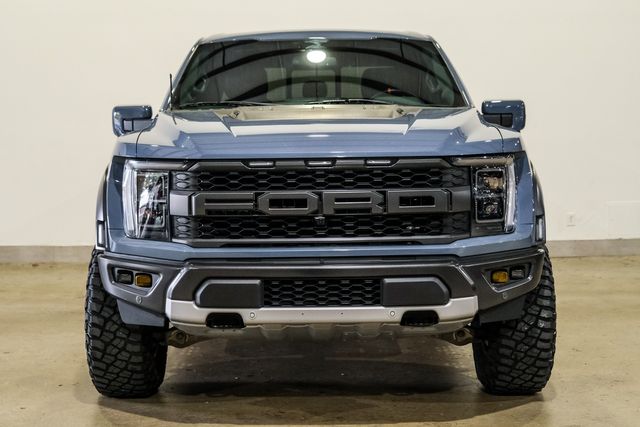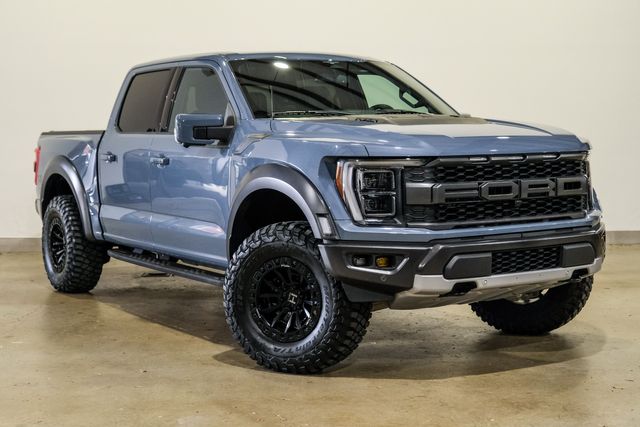 Our 2023 Ford F-150 Raptor 4X4 features a rare Azure Grey Metallic Tinted Clear Coat with a black leather interior. It has only 26,943 miles and comes with a Carfax report of three owners and no accidents. The vehicle is a non-smoker and includes remote start, RIGID INDUSTRIES LED FOGLIGHTS, and a TOUCH SCREEN NAVIGATION SYSTEM. It is equipped with a TWIN PANEL MOONROOF, BLIND SPOT CONTROL, and a POWER TILT/TELESCOPE STEERING WHEEL WITH AUDIO & CRUISE CONTROLS. The truck runs and drives great, offering both power and comfort for your journey.
