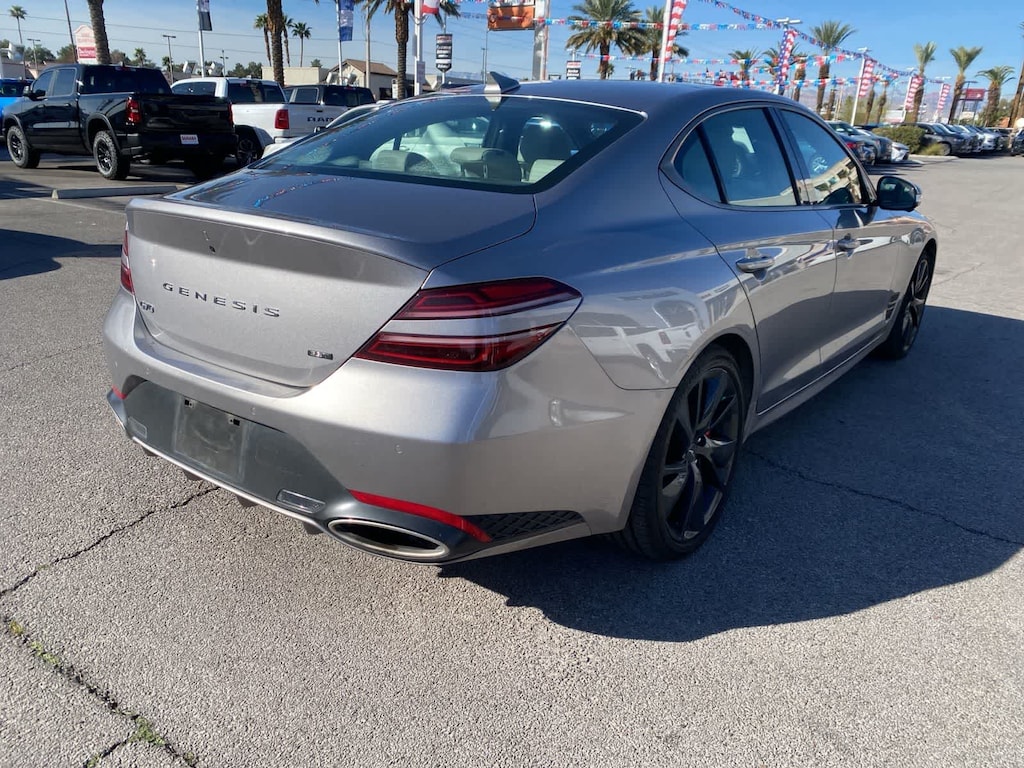 Our One Owner, Accident Free 2023 Genesis G70 3.3T Sedan with the Sport Prestige Pack blends breathtaking performance with a bold visual identity in Savile Silver! Powered by a Twin-TurboCharged 3.3 Liter V6 that provides 365hp to a paddle-shifted 8 Speed Automatic transmission with launch control to leap off the line. This Rear Wheel Drive sedan also sees nearly 27mpg on the highway with our Sport Prestige Packs style and substance upgrades. They add an electronically controlled suspension, Brembo brakes, a limited-slip rear differential, a wide sunroof, sport alloy wheels, a variable exhaust system, and a dark chrome grille to exclusive Two Line LED headlamps and a hands-free trunk. Enthusiasts love our advanced 3.3T cockpit with the Sport Prestige Pack because it adds heated/ventilated Nappa leather power front seats, a heated power steering wheel, wireless charging, Lexicon audio, a head-up display, and alloy pedals to dual-zone automatic climate control, a soft-touch instrument panel, keyless access/ignition, and eye-catching aluminum trim. High-tech infotainment includes full-color navigation, a 10.25-inch touchscreen, an 8-inch driver display, Apple CarPlay, Android Auto, and Bluetooth. Confidently move through your world with intelligent Genesis technologies such as Highway Driving Assist, a rearview camera, automatic braking, active blind-spot assistance, adaptive cruise control, and more. Our G70 3.3T is where luxury gets athletic! Save this Page and Call for Availability. We Know You Will Enjoy Your Lithia Sahara Chrysler Dodge Ram L0517 Test Drive Towards Ownership! Must finance with Chrysler Capital for all discounts to be applied.