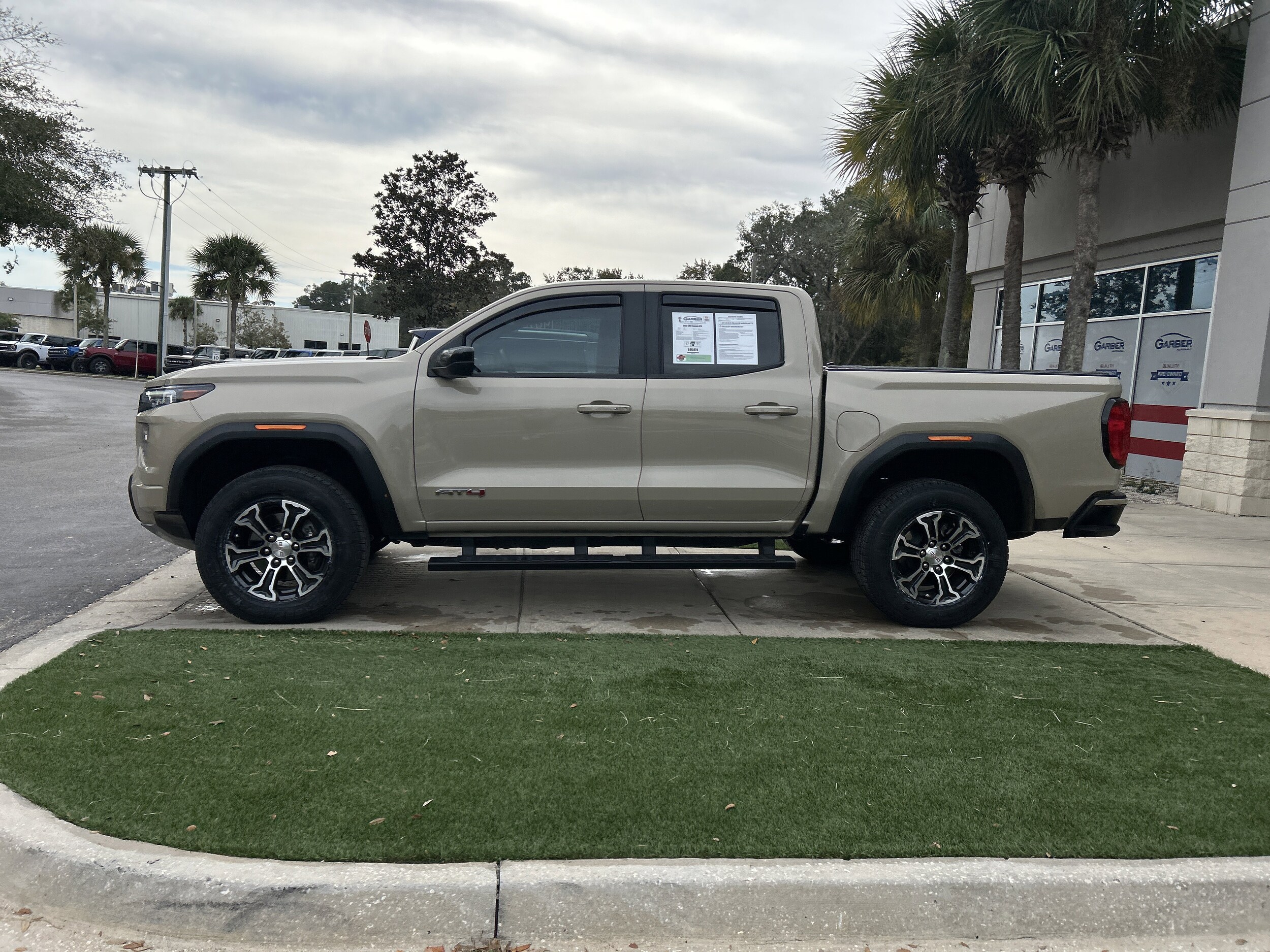 Lifetime Powertrain Warranty included! 2023 GMC Canyon AT4 Desert Sand Metallic window tint, 4WD, 120-Volt Bed Mounted Power Outlet, 2 1st Row USB Charge/Data Ports, 4-Wheel Disc Brakes, 6-Speaker Audio System Feature, 8-Way Power Driver Seat Adjuster, ABS brakes, Apple CarPlay/Android Auto, Auto High-beam Headlights, Auto-dimming Rear-View mirror, Automatic Emergency Braking, Automatic Locking Rear Differential, Black Assist Step (LPO), Canyon Pro Safety, Driver Mode Selector, Dual-Zone Automatic Air Conditioning, Electronic Stability Control, EZ-Lift & Lower Tailgate, Following Distance Indicator, Forward Collision Alert, Front Bucket Seats, Front fog lights, Front LED Fog Lamps, Front Pedestrian & Bicyclist Braking, Heated Driver & Front Passenger Seats, Illuminated entry, Inside Rear-View Auto-Dimming Mirror, Integrated Trailer Brake Controller, IntelliBeam Automatic High Beam On/Off, Lane Keep Assist w/Lane Departure Warning, MultiStow Tailgate, Navigation System, Power door mirrors, Power Driver Lumbar Control Seat Adjuster, Power Inner Sliding Glass Sunroof w/Manual Shade, Power windows, ProGrade Trailering System, Radio: 11.3" Diagonal Premium GMC Infotainment Sys, Rear of Console 120-Volt Power Outlet, Rear step bumper, Rear-Window Electric Defogger, Remote keyless entry, Remote Vehicle Starter System, Security system, SiriusXM w/360L, Speed control, Split folding rear seat, Spray-On Bedliner, Telescoping steering wheel, Tilt & Telescopic Manual Steering Column, Tilt steering wheel, Trailering App System, Trailering Package, Wheels: 18" x 8.5" Dark Gray Machined Finish Alum.