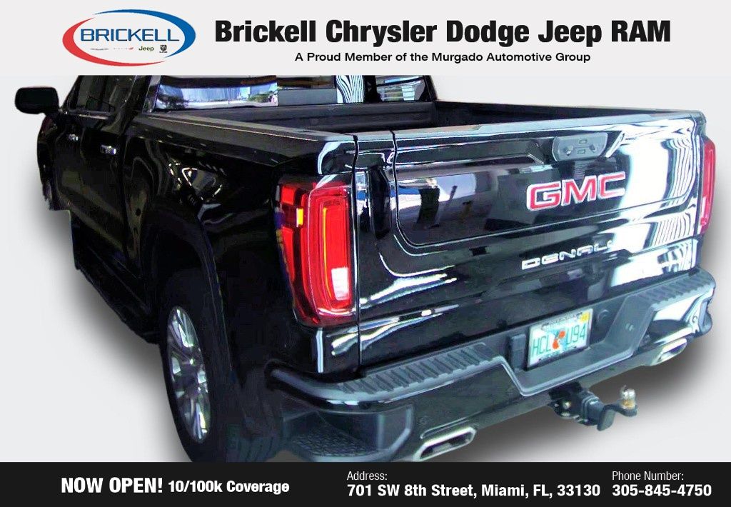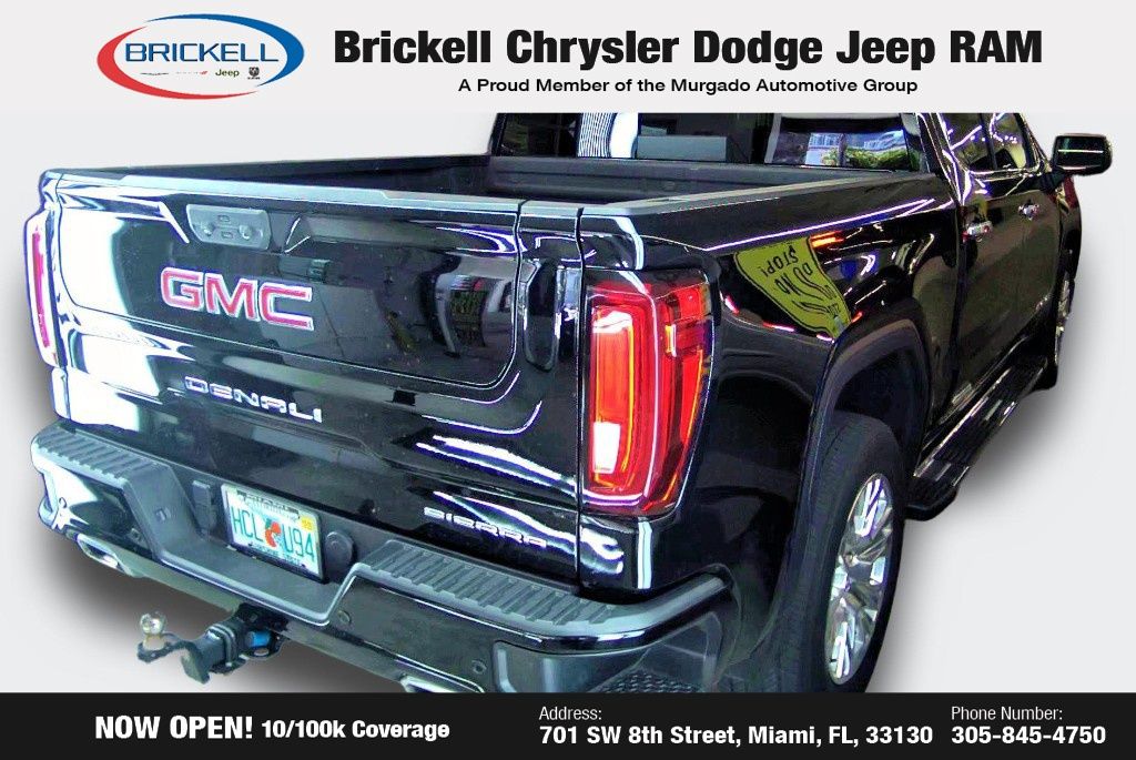 Onyx Black 2023 GMC Sierra 1500 Denali RWD 10-Speed Automatic EcoTec3 5.3L V8 10-Speed Automatic, Jet Black Leather. Find Your Perfect Pre-Owned Vehicle at Brickell Chrysler Dodge Jeep Ram At Brickell CDJR, we make buying a pre-owned vehicle easy and stress-free. Every pre-owned vehicle is thoroughly inspected to ensure quality and reliability. For added confidence, we include a 10-year/100,000-mile powertrain warranty on all non-European brands at no additional cost. Our dealership offers one of the largest selections of pre-owned inventory in the region, so you can find the right car, truck, or SUV for your needs. Our state-of-the-art service department, the largest in the country, is open seven days a week from 7 AM to 9 PM, ensuring your vehicle stays in top condition. Visit us at 701 SW 8th St, Miami, FL 33130, or call 305-777-2800 to learn more and schedule a test drive. The displayed price includes an incentive for financing with Brickell CDJR Finance Company. Price does not include our Perma-Plate. Outside financing and bank drafts are not accepted. All pre-owned vehicle exports are subject to an export fee. Taxes, title, registration, and dealer fees apply. Recent Arrival! Odometer is 12953 miles below market average!
