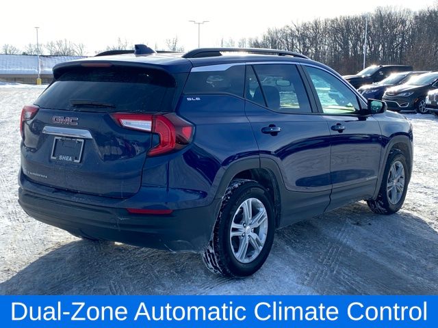 This 2023 GMC Terrain SLE offers a compelling blend of style, comfort, and versatility. Let's explore the impressive features that make this vehicle an exceptional choice. Designed to elevate your driving experience, this Terrain SLE comes equipped with a powerful 1.5L DOHC engine paired with a smooth-shifting 9-speed automatic transmission. With an impressive EPA-estimated 24 city/29 highway MPG, this vehicle delivers excellent fuel efficiency, allowing you to go further on every tank. This Terrain SLE has been meticulously inspected and certified to meet our highest standards of quality, giving you the peace of mind that comes with owning a reliable and well-maintained vehicle. Our certification process ensures that this Terrain has been thoroughly checked and any necessary repairs or maintenance have been completed, so you can drive with confidence. In addition to its impressive performance and features, this Terrain SLE also boasts a sleek and modern exterior design, with the Marine Metallic Blue paint complementing the bold and muscular lines of the vehicle. The interior of this Terrain SLE is equally impressive, with premium cloth seat trim, a 4.2-inch multi-color driver information screen, and a host of connectivity features, including wireless Apple CarPlay and Android Auto. The dual-zone automatic climate control and heated front seats ensure you and your passengers stay comfortable, no matter the weather. Whether you're commuting to work, embarking on a family road trip, or tackling your weekend errands, this 2023 GMC Terrain SLE is the perfect companion. With its impressive combination of style, performance, and versatility, this vehicle is sure to exceed your expectations. We invite you to experience the Terrain SLE for yourself and discover why it's the perfect choice for your next vehicle.