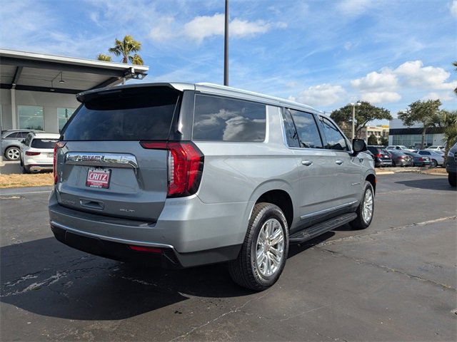 Clean CARFAX. CARFAX One-Owner. Sterling Metallic 2023 GMC Yukon XL SLT RWD 10-Speed Automatic with Overdrive EcoTec3 5.3L V8 Apple CarPlay, Android Auto, USB ports, Bluetooth, 2 presets for outside rearview mirrors, 2 presets for power driver seat, 3rd row 60/40 power-folding split-bench seat, adaptive cruise control, alloy wheels, Bose 9-speaker stereo audio system feature, bright chrome bodyside moldings, bright front & rear door sill plates, chrome door handles with body-color strip, enhanced automatic emergency braking, hands-free power programmable rear liftgate, HD Surround Vision, heated & ventilated driver & front passenger seats, heated 2nd row outboard position seats, heated driver & front passenger seats, heated steering wheel, inside rear-view auto-dimming mirror, navigation system, outside heated power-adjustable mirrors, power release 2nd row 60/40 split-folding bench seat, power tilt & telescopic steering column, Preferred Equipment Group 4SA, rear pedestrian alert, safety alert seat, SLT Luxury Package, universal home remote, wheels: 20 x 9 6-spoke polished aluminum, wireless charging.