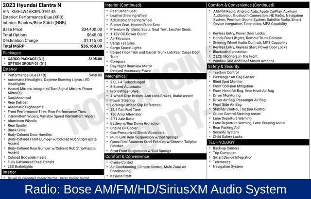 Discover the exhilarating performance and premium features of the 2023 Hyundai Elantra N Base. This dynamic sedan delivers an unparalleled driving experience, blending power, precision, and exceptional technology to elevate your commute and weekend adventures. Beneath the sleek exterior lies a thrilling 2.0L Turbocharged engine, mated to an 8-Speed Dual Clutch transmission, delivering an impressive 20 city and 30 highway MPG. The Elantra N's sport-tuned suspension and performance-oriented handling will have you eagerly anticipating every curve in the road, while the advanced safety features, including Automatic Emergency Braking and Lane Keeping Assist, provide the confidence you need. Experience the perfect blend of style, technology, and driving exhilaration in the 2023 Hyundai Elantra N Base. This exceptional sedan is priced at $26,933 and awaits your test drive. Visit our showroom today and discover the true meaning of N performance. The Elantra N's striking silhouette commands attention, with its bold front grille, sculpted lines, and distinctive rear spoiler. Step inside and you'll be surrounded by a cabin that seamlessly combines premium materials, thoughtful design, and cutting-edge technologies. The standard 8-inch touchscreen display with Navigation, Apple CarPlay, and Android Auto integration keeps you connected and in control, while the Bose premium audio system delivers an immersive listening experience. Comfort and convenience are also at the forefront, with dual-zone automatic climate control, heated front seats, and a power moonroof. The Elantra N's sport-inspired interior features supportive N-branded bucket seats, a leather-wrapped steering wheel, and an Alcantara-wrapped shift knob, elevating the driving experience to new heights. Beneath the striking exterior, the Elantra N's performance credentials shine. The turbocharged 2.0L engine and 8-speed dual-clutch transmission work in perfect harmony, delivering an exhilarating 276 horsepower and 289 lb-ft of torque. The sport-tuned suspension and performance-focused steering provide exceptional handling and responsiveness, ensuring you'll relish every curve and straightaway. Safety is also a top priority, with a comprehensive suite of advanced driver assistance technologies, including Automatic Emergency Braking, Lane Keeping Assist, and Blind Spot Monitoring. These features work seamlessly to help keep you and your passengers secure, no matter the driving conditions. The 2023 Hyundai Elantra N Base is a true standout in the compact performance sedan segment. With its captivating design, thrilling performance, and premium features, this vehicle is the perfect choice for the discerning driver who demands the ultimate in driving enjoyment.