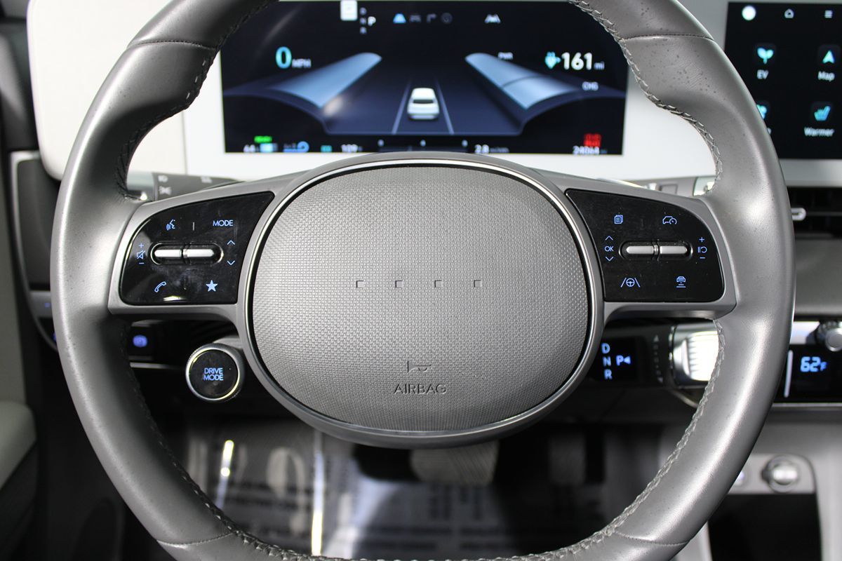 The 2023 Hyundai IONIQ 5 SE AWD, dressed in a striking Abyss Black exterior, is a perfect blend of modern aesthetics and cutting-edge technology. Its sleek lines and bold design are complemented by LED headlights that not only enhance the vehicle's stunning looks but also provide excellent nighttime visibility. Inside, the cabin is adorned with a sophisticated Gray interior, offering a serene atmosphere that balances elegant simplicity with futuristic features. The spacious interior is equipped with heated seats, ensuring a comfortable ride no matter the weather. Under the hood, the IONIQ 5 SE is innovatively powered by an electric motor, eliminating the need for cylinders while delivering efficient and responsive performance. This all-wheel-drive marvel features advanced safety technologies such as active cruise control, blind-spot monitor, forward collision warning, and lane departure warning. These features, alongside lane keep assist, ensure every journey is as safe as it is enjoyable, allowing drivers to navigate roads with added confidence. Parking is made effortless with the help of parking assist, taking the stress out of maneuvering into tight spaces. Connectivity and convenience are key highlights as the IONIQ 5 SE comes equipped with Bluetooth and an advanced navigation system. Practicality is enhanced with accessories such as carpeted floor mats and a cargo package. Overall, the Hyundai IONIQ 5 SE is a compelling choice for those seeking a stylish, technologically advanced, and environmentally friendly driving experience.