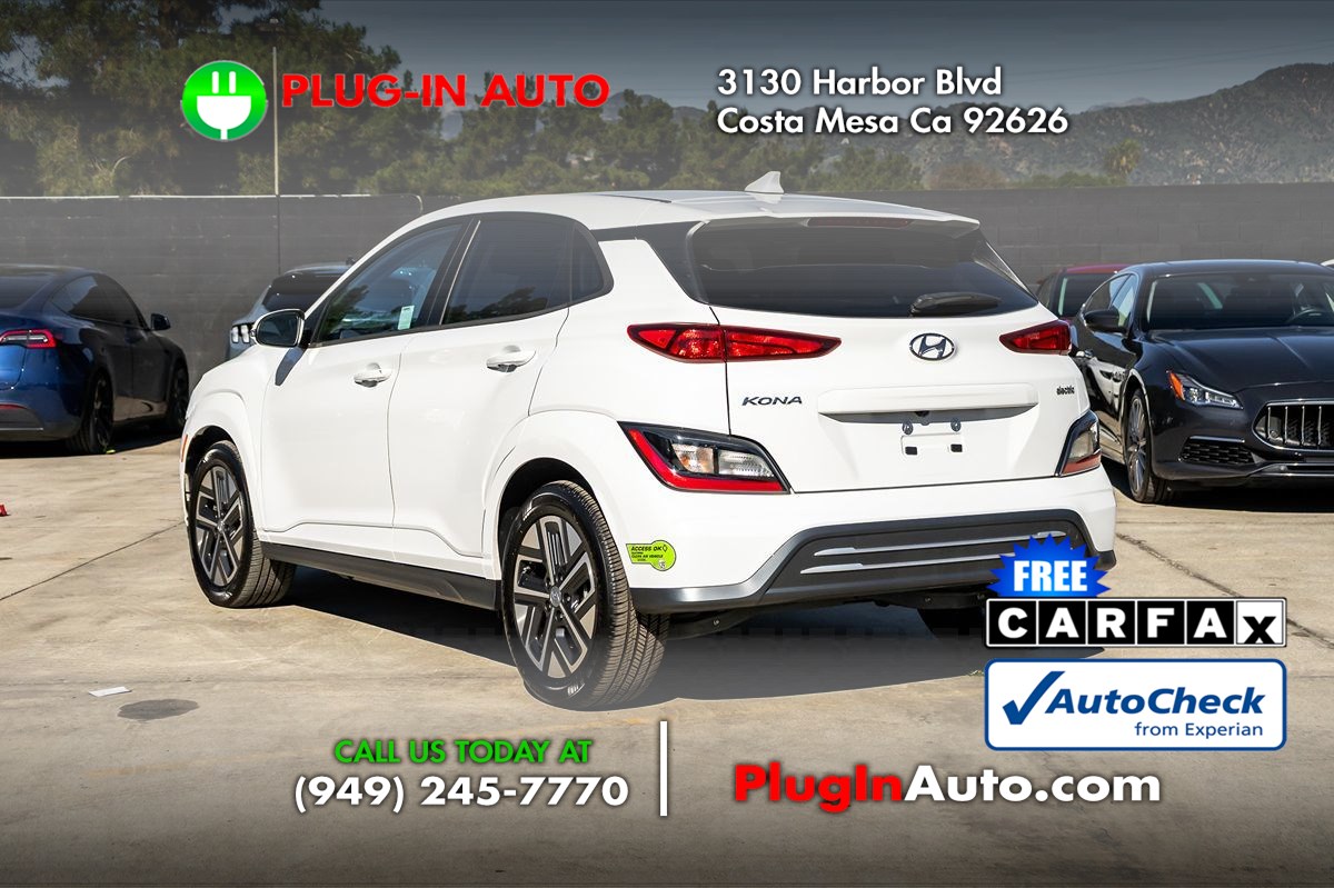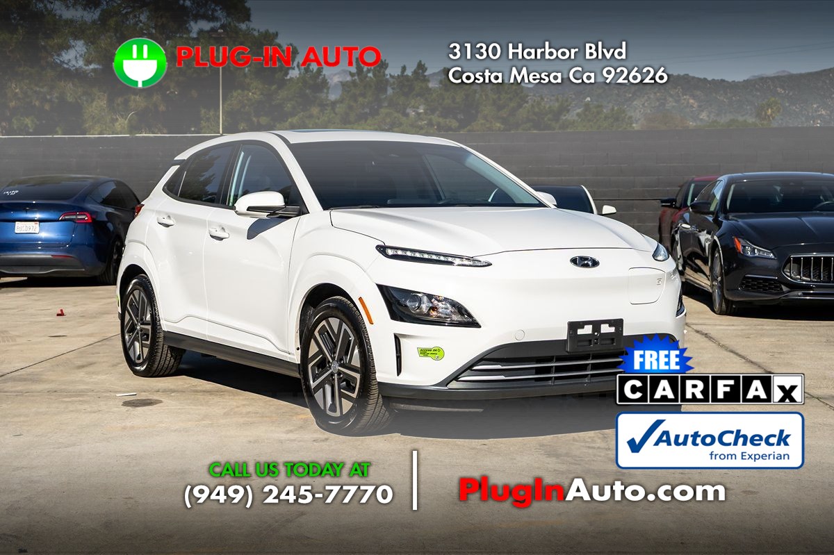 Our One Owner 2023 Hyundai Kona Electric SEL in Lunar White is made for miles and miles of adventure! Powered by an Electric Motor providing 201hp matched to a Single Speed Automatic transmission so it's easy to see the world in style. This Front Wheel Drive SUV also extends its reach with a 64kWh battery pack that enables nearly 258 miles of EV range at nearly 134MPGe in the city. Our Kona's compelling exterior design greets you with LED lighting, a power sunroof, roof rails, 17-inch alloy wheels, and heated power mirrors with built-in turn signals. The versatile layout of our SEL cabin is impressively comfortable with heated cloth front seats, eight-way power for the driver, a versatile back row, a leather-wrapped steering wheel, automatic temperature control, keyless entry, pushbutton start, and an easy-to-use infotainment system. The clever setup boasts a 10.25-inch driver display, a 10.25-inch touchscreen, full-color navigation, Android Auto/Apple CarPlay, Bluetooth, wireless charging, and an AM/FM/HD audio system with SiriusXM compatibility. For safety's sake, Hyundai provides intelligent driver assistance from forward collision avoidance, blind-spot monitoring, lane-keeping assistance, a rearview camera, a driver attention monitor, a rear-seat reminder, tire pressure monitoring, and more. You can turn heads and tackle busy days in our Kona Electric SEL! Save this Page and Call for Availability. We Know You Will Enjoy Your Plug In Auto Costa Mesa Test Drive Towards Ownership!