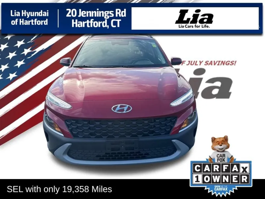 Standard features include Bluetooth, Lane Keeping System, Collision Warning System, and more. This 2023 Hyundai Kona SEL is in Ultimate Red with a remainder of factory warranty. It has been serviced and detailed.
