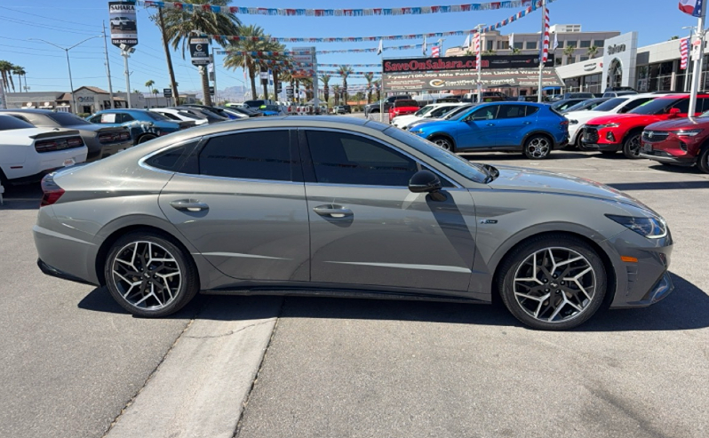 The 2023 Hyundai Sonata N Line 2.5T in Hampton Gray is a striking blend of performance and sophistication, embodying a sleek design with a formidable performance edge. Under the hood lies a robust 2.5L 4-cylinder engine, turbocharged to deliver exhilarating power and a responsive driving experience. With a refined exterior, the Hampton Gray hue accentuates the Sonata's bold lines, complemented by an athletic stance designed to command attention. Inside, the Sonata N Line boasts luxurious Black leather seating surfaces, offering both comfort and style. The interior is technologically advanced, featuring a premium sound system and seamless Bluetooth connectivity, ensuring a connected and enjoyable ride. Safety is paramount with features such as active cruise control, forward collision warning, and a blind spot monitor, which work harmoniously to keep occupants protected and confident on the road. The convenience features of the 2023 Sonata N Line further enhance its appeal, including heated seats and a hands-free liftgate for effortless access to the spacious trunk. Equipped with driver-assistance technologies like lane departure warning and lane keep assist, this vehicle offers peace of mind on long journeys. Additional thoughtful touches include the panoramic sunroof, cargo tray, trunk cargo net, and carpeted floor mats, adding practicality and luxury to every drive.