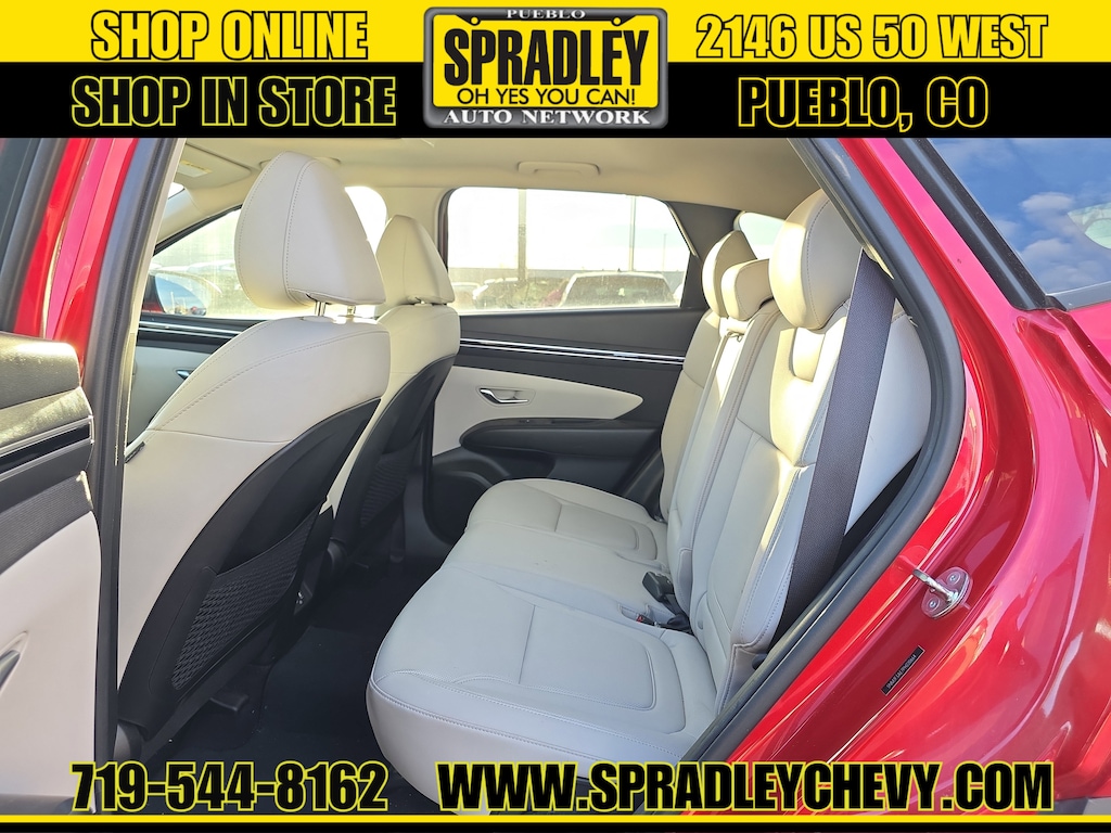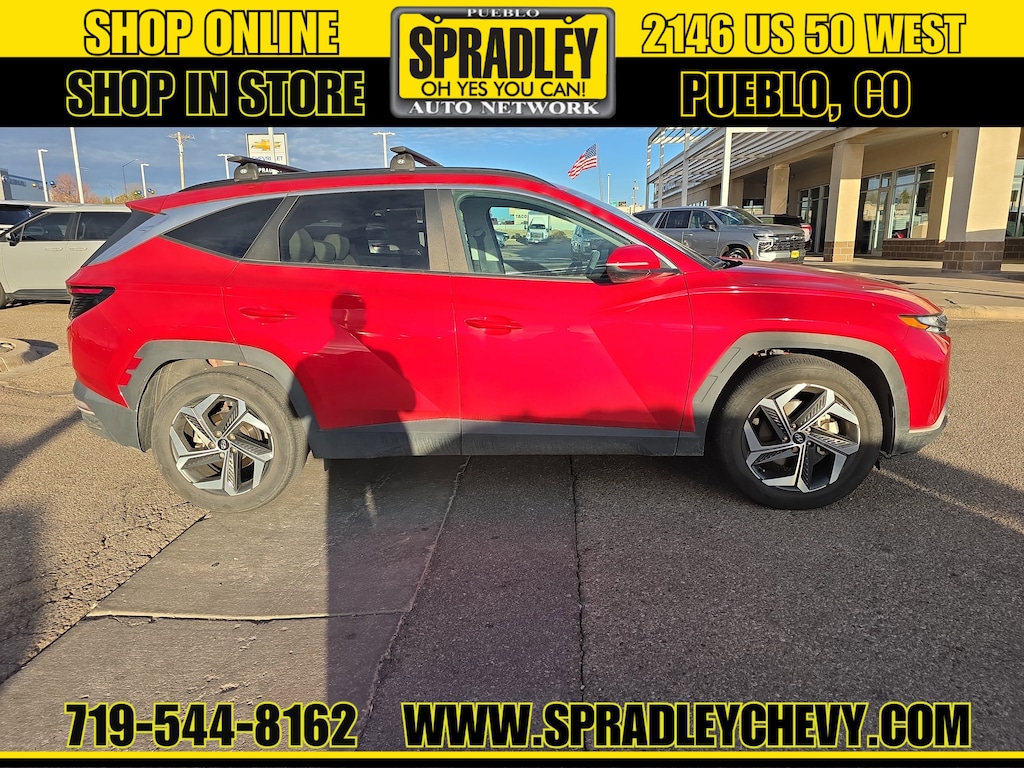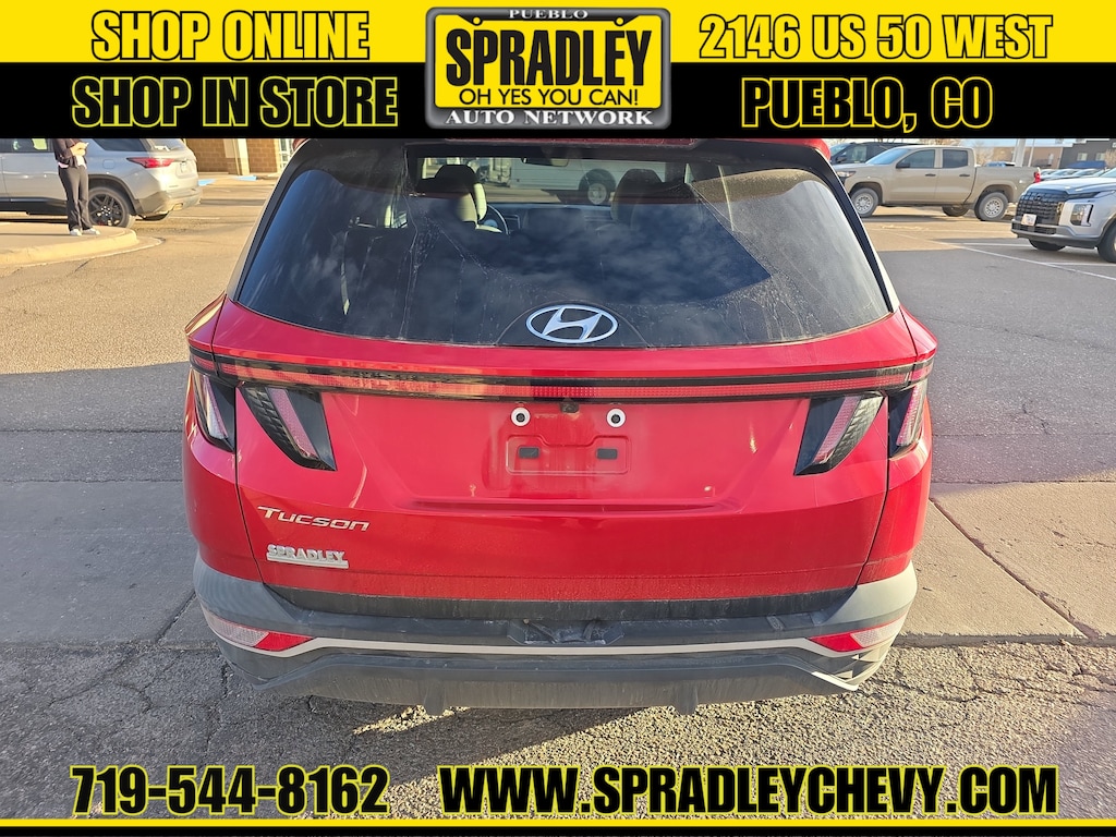 CARFAX One-Owner. Clean CARFAX. Calypso Red 2023 Hyundai Tucson SEL FWD 8-Speed Automatic with SHIFTRONIC 2.5L I4 DGI DOHC 16V LEV3-ULEV70 187hp. Recent Arrival! Odometer is 32639 miles below market average! 25/32 City/Highway MPG. Come in and see why people buy from Spradley Chevrolet Hyundai and then send their friends and family. We pride ourselves on being the best in customer service and giving you the best deal possible. And if you have good credit, bad credit, bankruptcy, or are a first time buyer, we can help! Call Spradley Chevrolet Hyundai’s Internet Department today at 719-544-8162 and schedule your time to come in and test drive any of our new Chevrolet Silverado 1500, Impala and Suburban’s or Hyundai Santa Fe, Tucson and Accent’s. And don’t forget, we have all makes and models of pre-owned vehicles to choose from. Located at 2146 HWY 50 West, Pueblo, Colorado.