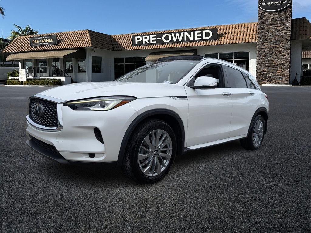 Welcome to Schumacher Automotive Delray, where buying a pre-owned vehicle is more than a transaction, it's joining our family. As a proud, family-owned business located at 2102 South Federal Highway in Delray Beach, Florida, our mission is built entirely around your satisfaction and helping you find the perfect vehicle to fit your life and budget. We understand the importance of trust and transparency in every purchase, and that's why we invite you to experience the Schumacher difference for yourself. Come join the family! Recent Arrival! Odometer is 2957 miles below market average! 2023 Infiniti QX50 Luxe Radiant White I4 FWD Clean CARFAX. CARFAX One-Owner. Act fast—our aggressively priced, high-quality pre-owned vehicles at Schumacher Automotive Delray simply do not last; visit us today at 2102 South Federal Highway, Delray Beach, Florida 33483, or contact us right away to secure yours before it's gone!